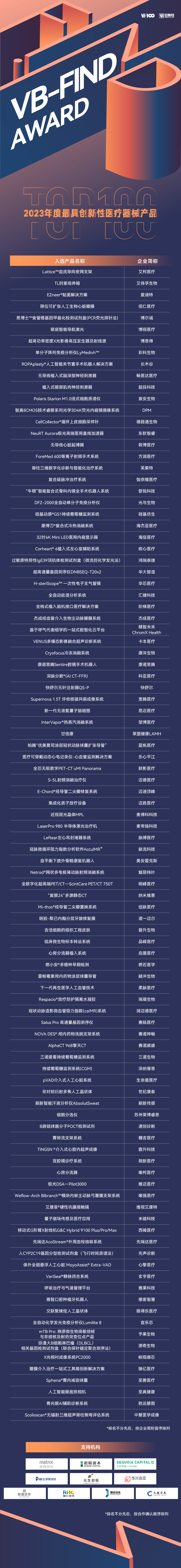 自2014年对创新医疗器械开辟“绿色通道”以来,国产创新器械加速获批上市。据国泰君安证券报告《创新医疗器械行业机会渐行渐近》数据显示,截止2022年12月,已有超过400个产品进入创新医疗器械特别审查通道,并以国产为主。从获批产品领域来看,血管介入类、体外诊断类、影像设备类是纳入绿色通道的前三大品类。 创新是中国医疗器械产业向高端发展的必由之路。发展路上,国产创新依旧是中国医疗器械产业升级的主旋律,未来拥有自主创新能力,产品技术附加值高,具有差异化竞争优势的医疗器械企业有望快速成长。相对来说,医疗器械比药品的创新迭代更快,往往一个细分领域下拥有多个单品,由此组成整套解决方案,适用于更多临床需求。 为发现具有技术先进性、满足医学临床需求、行业示范效果突出的医疗健康创新产品(解决方案),动脉网VB100于2022年推出了面向医疗健康产业创新产品(解决方案)的年度品牌评选活动——VB-Find Award,“Find”寓意生命健康领域发现与探索的历程,也指代被发现的改变现代医疗的创新产品。动脉网VB100希望通过VB-Find Award评选,打造医疗健康前沿研究及应用成果展示平台,赋能医疗健康企业品牌成长,同时深入剖析我国医疗健康行业发展现状,探索未来医疗创新范式。 2023年6月,VB-Find Award面向高值耗材、医疗设备、体外诊断等创新医疗器械产品(解决方案)发起征集。历经近40天,经企业报名、机构推荐、专家评审、交叉复核等层层评选,采用AFIC-12Ps评估模型,对参选医疗器械产品(解决方案)在应用价值、驱动支持、创新迭代、互动传播四个维度共12个指标的年度表现进行加权打分评选,最终从300余个报名表中,评选出100个入围产品(解决方案)。 特别鸣谢 本届VB-Find Award评选活动,组委会共邀请到8家2023年未来医疗100强·澎橙奖·年度医疗器械投资机构、2家2023年未来医疗100强·澎橙奖·年度医疗健康财务顾问机构共10家机构的资深器械投资人担任评审委员,对申报项目依据AFIC-12Ps评估模型进行加权打分、交叉评选;同时,推荐未参与申报的优秀创新医疗器械产品参加评选。在此,特别鸣谢10家支持机构对本届VB-Find Award评选活动的支持。 评选发布 VB-Find Award:2023年度最具创新性医疗器械产品(解决方案)TOP100于2023年8月12日在2023医疗器械产品创新与国际合作峰会上进行发布。 (如想对接上榜企业,可点击“阅读原文”填写需求对接表单) 本届入选创新产品展示 近年来,人工智能技术、3D打印技术、5G技术、高分子材料等前沿技术研究都被应用到器械产品研发及临床研究中;医工交叉带来材料、结构、控制和生肌电信号处理技术方面的进步,推动可穿戴纺织外肌、人工心脏、人工眼等人工器官研发取得突破。技术上每前进一步,将会衍生新的产品,为患者带来切实的临床获益。 在本次入选产品中,组委会尝试着从技术创新性、产品独特性、创新进展及成果、应用价值、市场空间、政策支持/资本助力情况对各个产品进行剖析,以更多维度的视角观察创新医疗器械创新的方向和产品研发及商业化进程。本文中将简要介绍入选优秀案例产品,更多信息敬请关注“VB-Find 产品信息Q&A海报”。 瑞凝生物 入选产品:Respacio®放疗防护隔离水凝胶 产品阶段:临床试验 产品简介: Respacio®放疗防护隔离水凝胶-全球首款针对宫颈癌的放疗防护隔离产品,通过微创的注射方式植入肿瘤与直肠之间并建立稳定的隔离空间,从而显著减少直肠及其它邻近健康组织的辐照剂量,有效降低放射性直肠损伤。目前,Respacio®正在北京协和医院、复旦大学附属肿瘤医院和中山大学肿瘤防治中心等多家国内知名三甲医院进行注册临床研究,并已完成临床所有病例的入组,临床数据达到良好预期。 产品技术创新性: 虽然聚乙二醇(PEG)水凝胶产品在国外已发展较长时间,但 PEG 水凝胶凝胶特性的精准调控仍是一个很大的技术难题。瑞凝生物另辟蹊径开发了创新型 PEG 水凝胶技术路线,使用独特的PEG衍生物技术和存储工艺技术,使得 PEG 衍生物在水溶液中的稳定时长从1小时提高到两年以上,极大提高了产品的存储稳定性和使用便利性。 产品独特性: 瑞凝生物通过不断的技术突破,实现了对水凝胶原位固化特性、力学性能、降解特性、溶胀特性、生物相容性等一系列性能的精准调控,建立了瑞凝独有的、全球首创“即用型”PEG水凝胶平台,并结合临床使用需求提供创新水凝胶解决方案。针对国内宫颈癌发病率高且放疗占比高的临床现状,瑞凝生物开发出全球首款宫颈癌放疗防护隔离水凝胶,并建立基于该产品的宫颈-直肠隔离临床治疗方案,用于降低或预防放射性直肠损伤。 除了结合目前常用的放疗模式外,Respacio®还有望助力放疗模式的升级,包括提升单次放疗剂量、缩短放疗周期和支持复发性肿瘤再程放疗等,对肿瘤患者放疗效果和生活质量的提高具有重要意义。 产品的创新进展和成果: 瑞凝生物突出的技术能力使得其核心产品在全球范围内具备独特原创性,相关研究成果已授权多篇中国发明专利,并已申请多篇 PCT专利和美国专利。 瑞凝生物 Respacio®产品于 2023年4月登场亮相中国放射性肠损伤研究协作组多学科研讨会暨第二届中国盆腔放射性损伤高峰论坛,北京协和医院放疗科主任张福泉教授团队在全球范围内首次发布产品的注册临床研究第一阶段总结报告及优秀临床