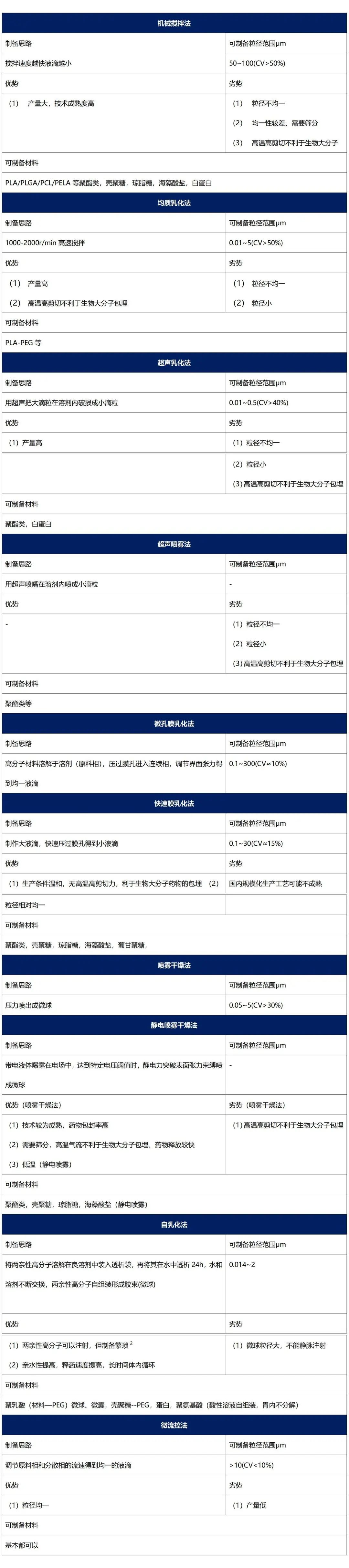 本篇将着重介绍以单体为原料制备、以高分子为原料制备的微球制备技术以及复合微球的制备和多孔微球的制备。 一、以单体为原料制备 1.制备思路该方法主要采用ST、MMA等单体原料制备聚苯乙烯(PST)微球、聚丙烯酸酯微球(PMMA)等微球。主要的制备思路:单体合成,单体带有双键,双键经过引发剂可引发自由基聚合形成高分子(也可以通过缩聚方式制备高分子)。悬浮聚合法、乳液聚合法、膜乳化法、种子法、微流控法等几种方法,其中,国内色谱层析介质的龙头企业纳微科技采用种子法制备微球。 采用上述几种制备方法获得的微球粒径大小如下图[1]: 2.以单体为原料制备微球所用试剂 以苯乙烯、丙烯酰胺单体为例,在制备微球过程中,通常会使用以下多种试剂: (1)稳定剂:PVA(聚乙烯醇,水溶性,常用)、PVP、CMC(羧甲基纤维素),主要作用是:分散剂或乳化剂,分散原材料至连续相,防止微球液滴粘连吞并 (2)引发剂:KPA(过硫酸钾,水溶性),主要作用是:预热分解成自由基开始链引发 (3)乳化剂:十二烷基硫酸钠、SDS,主要作用是:分散原材料至连续相,设计成核地点和机制 (4)阻聚剂:HQ、NaNO2,主要作用是:防止单体和自由基在设计以外的地方成核 二、以高分子为原料制备 该方法主要用于制备琼脂糖、壳聚糖、白蛋白等天然高分子微球或聚乳酸、聚己内酯等聚酯类生物可降解高分子微球。其原料聚乳酸、葡聚糖、琼脂糖等高分子材料。主要的制备思路:将高分子溶解在有机溶剂或水中制备成溶液,在和与之不相容的水或溶剂混合乳化,制备成O/W(水包油)、W/O、W/O/W或O/W/O型乳液后,用适当的物理或化学交联方法使液滴固化成微球和微囊。固化方法需要根据高分子的物理化学性质来选择或开发不同的方法。乳化方法主要包括:机械搅拌法、均质乳化法、膜乳化法;固化方法包括:自固化法、物理/化学交联法、溶剂挥发/箤取法、单/复凝聚法。其中,机械搅拌法方法较为常用。 1.乳化方法 2.固化方法 (1)溶剂挥发法:使用熔点低的溶剂,如二氯甲烷,常温减压使其挥发。该方法可用于制备聚酯类微球,脂质体和高分子囊泡。 (2)溶剂箤取法:使用水溶性高的溶剂,使溶剂可扩散进入水中被除去。该方法可用于制备聚酯类,琼脂糖微球。 (3)化学交联法:对高分子交联得到固化的微球。如:壳聚糖带有氨基,可采用戊二醛进行化学交联,除此外,葡甘聚糖,白蛋白也可采用化学交联法。 (4)物理交联法(离子固化法) 内部固化法:将会与酸反应生成阳离子的粉末加入材料中,将混合物滴入酸性水溶液,氢离子进入液滴内部与粉末反应生成阳离子并从内而外与材料交联固化。 外部固化法:将材料滴入含阳离子的溶剂,固化从微球表面向内部逐渐变慢。其优势为包埋率高,例如:海藻酸盐带有负电荷,可采用Ca2+等二价阳离子来物理交联。 (5)自固化法 冷却固化:通过冷却凝固成固体,常用于琼脂糖微球的制备。 高温固化:亲水性高分子蒸发去水分化使微球固化,可用于制备壳聚糖,琼脂糖,白蛋白,聚氨基酸等微球,其劣势为高温下药物容易失活。 (6)单凝聚法(沉淀法):材料在烯酸溶剂中溶解,滴加浓酸使其析出成球;或在材料中加入会蒸发的极性溶剂去除材料中的水;在材料可溶的溶剂里加入不可溶的溶剂使其析出。其优势在于可以避免戊二醛等化学交联剂的使用,可用于制备聚酯类,壳聚糖,海藻酸盐,白蛋白等微球。 (7)复凝聚法:两种带相反电荷的高分子材料,离子间交联形成复合微球或微囊,体系接近等电点而使溶解度降低,析出沉淀。其优势在于不使用有机溶剂和化学交联剂,保持包埋药物活性,药物在酸性条件下(例如胃部)不释放,可用于制备壳聚糖+海藻酸盐微球;其劣势为微球直径受滴管影响,难以大规模产业化。可用于制备壳聚糖+海藻酸盐微球,及壳聚糖+海藻酸盐/酪蛋白/明胶/聚磷腈、海藻酸盐+壳聚糖/聚赖氨酸/明胶微球等。 3.以高分子为原料制备微球所用试剂 三、复合微球的制备 最常用的复合微球是高分子磁性微球,医疗上主要用于IVD检测试剂、细胞筛选等用途。 1.以单体为原料制备高分子-无机复合微球 高分子-无机复合微球能够兼具高分子和无机材料两者的优势,既拥有有机材料的可塑性、易加工性及生物兼容性,同时具备无机物的刚性、磁性以及导电性等性能。制备方法较多,思路主要分为四类: (1)以无机颗粒为核,在核上进行单体聚合的方法 (2)以高分子微球为核,在高分子微球上原位生成无机颗粒的方法 (3)将无机颗粒和单体混合制备成液滴,然后通过聚合将无机颗粒包埋在微球内的方法 (4)利用静电相互作用等其他方法。 2.以高分子为原料制备有机-无机复合微球 以高分子为原料制备有机-无机复合微球,最常用的方法是悬浮法和细乳液法,制备思路均为将无机颗粒分散在分散相中,和连续相混合后,固化成球。区别在于悬浮法粒径较大,细乳液法粒径较小。 四、多孔微球的制备 多孔及高开孔微球在三维细胞培养、分离纯化介质等领域发挥着极其重要的作用。 常用的制孔剂有气体生成型致孔剂(如碳酸氢铵、碳酸氢钠、过氧化氢)、渗透型致孔剂(氯化钠、氯化钾等)和可提取型致孔剂(Pluronic,脂肪酸盐等)。造孔最常用方法为制孔剂浸出法,将制孔剂与原料相混合,并用溶剂将其浸出以形成孔结构。 在高分子中空微球的制备中,常用的制备溶剂为乙醇/二氯甲烷的混合液,间或混合异丙醇、丙酮