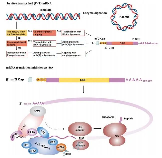 mRNA设计和合成是基于mRNA药物的关键步骤。mRNA具有五个功能区,包括5'帽、5' 非翻译区(5' UTR)、开放阅读框(ORF)、3'非翻译区 (3'UTR)、3'poly(A)尾。其中,帽子结构对mRNA来说至关重要,它不仅可与真核生物翻译起始因子(eIF4E)结合来启动翻译,而且还能保护mRNA不被核酸外切酶降解,同时可促使mRNA环化形成空间结构,增强稳定性。