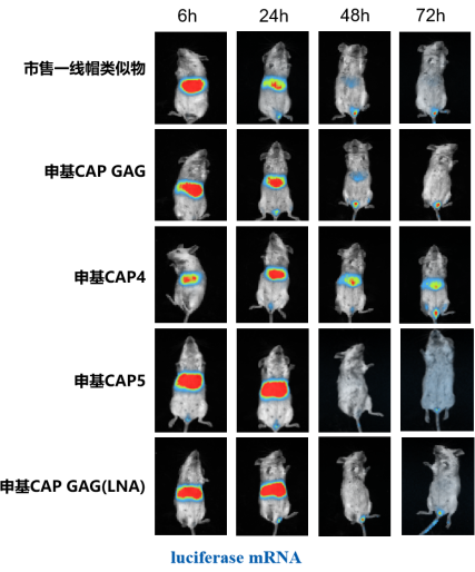 为了验证新型帽类似物修饰的mRNA在体内的表达情况,申基生物用不同种帽类似物合成luciferase mRNA进行活体转染,结果表明,与市售一线帽类似物相比,申基生物新型帽类似物合成的mRNA可在体内进行高表达!