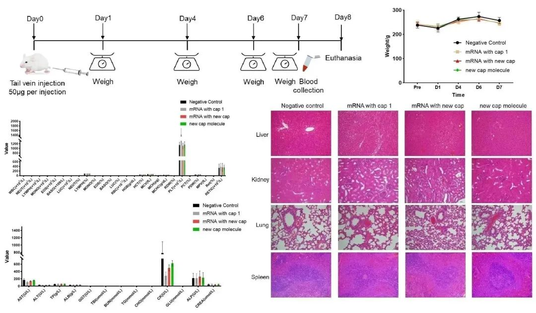为了更好的对新型帽类似物进行生物学安全性评价,申基生物特进行生物学相关实验,对小鼠分别进行尾静脉注射新型帽类似物合成的mRNA、新型帽类似物等,然后对小鼠进行相关分析,包扩体重、血液以及组织,和对照组相比,小鼠体重没有发生明显变化,且血液相容性和组织相容性良好!