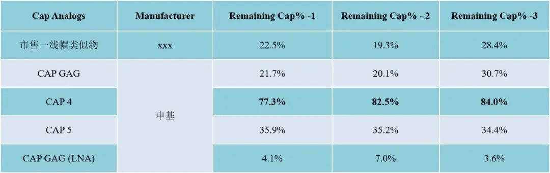 申基生物对不同帽类似物合成的mRNA进行脱帽实验(3次重复),结果表明,与市售一线帽类似物合成的mRNA相比,申基生物新型帽类似物CAP4抗脱帽能力脱颖而出!