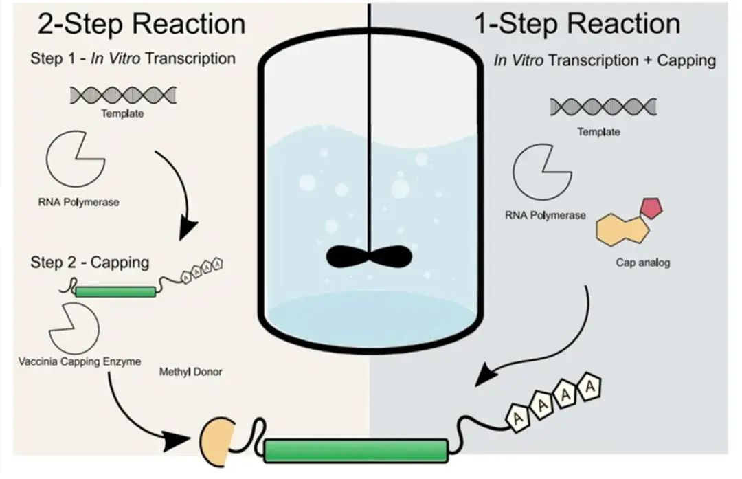 “共转录加帽”则是在IVT反应体系中直接加入Cap 1帽类似物,实现一步法获得含Cap 1结构的mRNA,全程只需一次纯化。这种“一锅法”反应减少了制造步骤,进而有效缩短整体处理时间、简化纯化步骤,可迅速提升mRNA疫苗/药物的产能,是目前mRNA产业化制备最受青睐的mRNA加帽方式。