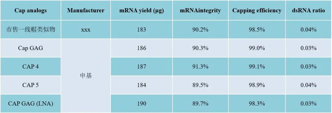 为了验证自研新型帽类似物体外转录效果,我们做了不同帽类似物的 IVT实验,同时与市售一线帽类似物进行对比,结果表明,申基生物新型帽类似物在产量、mRNA完整性、加帽率以及dsRNA杂质方面,与市售一线帽类似物无显著性差异!
