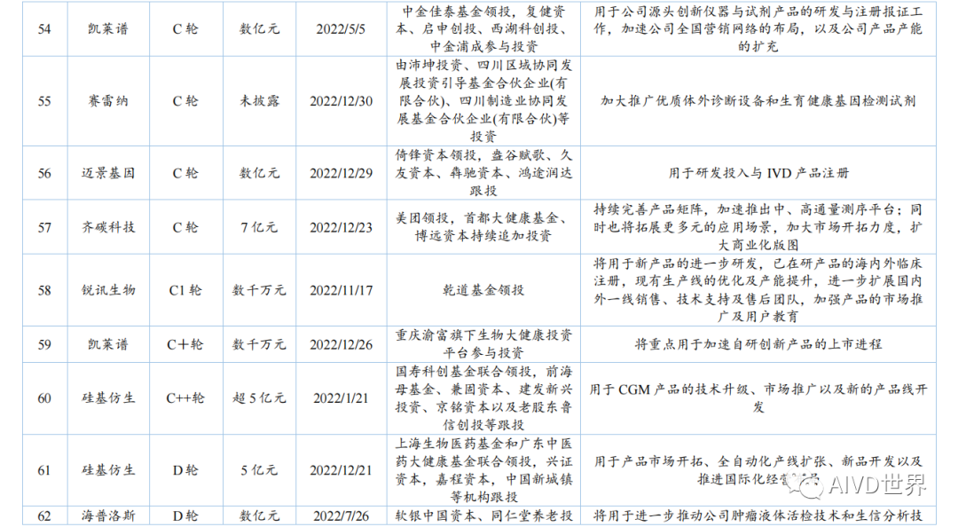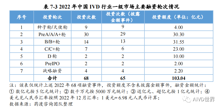 | 体外诊断试剂(In vitro diagnosis,IVD)是指按医疗器械管理的体外诊断试剂,包括在疾病的预测、预防、诊断、治疗监测、预后观察和健康状态评价的过程中,用于人体样本体外检测的试剂、试剂盒、校准品、质控品等产品。按照检测原理和应用领域,可分为生化诊断、免疫诊断、分子诊断、血液诊断、微生物诊断和即时检测(Point-of-Care Testing,POCT)。Kalorama information 数据显示,2022 年新冠检测相关市场份额降低至 25.58%,但全球 IVD 整体市场容量从2021年的 1233.68 亿美元增长至1273.80 亿美元,增速为 3.25%。随着疫情影响消退,新冠检测相关的市场将持续缩减,但整体 IVD 市场受癌症检测、血糖检测等项目的带动仍将保持增长,预计至 2027 年将超过 1400 亿美元。此外,越南、土耳其、韩国、阿联酋、沙特阿拉伯、中国等新兴市场将持续助力全球 IVD 市场的发展。截至2023年H1,2022年-2023 年 H1 共有 8 家 IVD 企业上市,其中2022年上市企业数为 7 家,2023年H1上市企业数为1家。2022年与2021年相比减少10家企业。上述 8 家企业的融资情况如下表所示。由上表可知,2022 年中国新上市的 IVD 企业共计 7 家,分别为仁度生物,云康集团、美因基因、英诺特、华大智造、新芝生物及康为世纪。其中,云康集团,美因基因于港交所成功上市。上述7家企业的IPO融资金额共计76.41亿人民币,其中,华大智造融资额最高,约36亿人民币。2023年H1中国新上市的IVD企业仅艾迪康1家,融资额为3.74 亿人民币。除艾迪康外,致善生物、联川生物、中翰盛泰生物、雅睿生物、硕华生命科学均在2023年H1阶段上市失败(8月7日,荣盛生物IPO终止)。此外,还有一大批 IVD 企业还在审核中,如全式金、世和基因、凯实生物、达科为、沃文特、英科新创等。注:由于某些融资事件未披露原因,本章节 IVD 企业融资事件为代表性企业主要融资事件,非完全统计。2022年中国经历了疫情反复影响,并于年底施行放开政策。与2021年相比,2022年中国 IVD行业整体融资金额出现大幅下降,约为103 亿元[3]。2023年 H1 中国IVD行业融资金额约为20亿元。2022年-2023年H1中国IVD行业一级市场代表性企业的融资情况如下表所示。由上表可知,2022年-2023年H1中国IVD行业一级市场融资主要涉及分子诊断、免疫诊断、质谱检测、生化检测等领域。在上述 96 项投资事件中,共涉及 87 家企业。其中,获亿元以上融资的事件共计 44 项,涉及 41 家企业,按年份统计,2022年获亿元以上融资的事件共计 34 项,2023 年 H1 获亿元以上融资的事件 10 项,明显少于 2022 年度融资金额。齐碳科技完成 7 亿元 C 轮融资,硅基仿生同年获得 2 次 5亿元及以上融资,9 家企业获得数亿元(以 5 亿元统计)融资。2022年-2023年H1中国IVD行业各轮次融资情况如下表所示。由上表可知,2022 年中国IVD行业一级市场融资总额为 103.04 亿元。从融资企业所处轮次看,处于B轮之前的事件约占 58%。在融资额度方面,B/B+轮融资金额最高,为31.55 亿元;其次为 Pre A/A/A+轮,为30.30亿元。由上表可知,2023年H1中国IVD行业一级市场融资总额为20亿元。从融资企业所处轮次看,处于B轮之前的事件约占46%。在融资额度方面,Pre A/A/A+轮融资金额最高,为 9.60 亿元;战略融资事件多未披露金额。2022年全球IVD整体市场容量增速放缓,市场规模较2021年增幅 3.25%。随着疫情影响消退,癌症检测、血糖检测等项目将带动整体市场保持增长,预计至 2027年全球IVD市场将超过1400亿美元,以中国为代表的新兴市场也将持续提供助力。在二级市场融资方面,由于核酸检测业务曾经一度火热,2021 年中国新上市的IVD企业数量为 17家;到2022年中国新上市的IVD企业数量显著降低,仅有7家,分别为仁度生物、云康集团、美因基因、英诺特、华大智造、新芝生物及康为世纪;而2023年H1 仅有1家 IVD企业上市成功。2022 年-2023年H1 8家IVD企业的IPO融资金额共计80.15亿元人民币,其中,华大智造融资额最高,约36亿人民币。在一级市场融资方面,2022年中国 IVD 行业整体投融资力度减弱,投资总额约103 亿元(较2021年的140亿下降26%)。而这一变化在2023年H1呈现的更为明显,上半年中国 IVD行业投融资约为20亿元,仅为2022年度的20%,投资市场降温明显,并且IVD赛道融资有多样化趋势,如微流控芯片、生物原料、生物组学、超低温冷藏设备等。在超亿元的投资事件中, 2022年获亿元以上融资的事件共计34项,2023年H1获亿元以上融资的事件10项,对于大额投资,投资机构更趋于谨慎。齐碳科技完成 7 亿元 C 轮融资,硅基仿生同年获得 2 次 5 亿元及以上融资,9 家企业获得数亿元(以5亿元统计)融资。 [1]《体外诊断试剂注册管理办法(试行)》 [2] 简 析 《 全 球 体 外 诊 断 检 测 市 场 》 第 15 版 (https://new.qq.com/rain/a/20221109A0103C00) [3] 国创联行:2022 中国医疗器械领域融资达 638 次融资总额为 268.9 亿元 (https://business.sohu.com/a/654126512_121124566) |