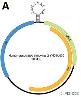| 云南的研究人员通过高通量测序技术在回溯的吸毒人员的血液样本中鉴定出与PCV3亲缘最近的人类的圆环病毒HuCV2。我们知道圆环病毒是单股环状的DNA病毒,其宿主谱是比较广的已经有报道的除了哺乳动物还有鸟类、鱼和昆虫等,在猪上面已经发现了PCV1-4,其中PCV1是最早发现的认为是一种污染细胞的病毒,对猪只其实不致病,而PCV2是当前主要关注的能够引起断奶仔猪多系统综合征、皮炎肾病综合征等圆环病毒相关疾病,而PCV3和PCV4则是近几年发现的。来自复旦大学和中科院昆明所依据昆医的研究团队,对中缅边境的注射吸毒人员进行血浆中的病毒感染情况回溯调查,他们对09年以来的近100名注射吸毒的瘾君子的血样进行病毒鉴定分析,在血样中除了鉴定出HIV-1和HBV(乙型肝炎病毒)和HCV(丙型肝炎病毒)以外,还发现细环病毒(Anelloviridae,原来在猪上发现的TTV就属于这个科)、黄病毒、圆环病毒、正粘病毒、乳头瘤病毒、肺病毒、细小病毒和三角病毒(Kolmioviridae)的成员。其中从两名感染 HIV-1和/或HCV两者的静脉吸毒者的血液中(2009年采的样品,患者应该于2010年和2014年分别去世了)鉴定出一种新型圆环病毒——人类相关圆环病毒 2 (human-associated circovirus,HuCV2)。 HuCV2 与猪圆环病毒 3 亲缘关系最近(其实也只有60.5%)。该研究其实主要是对该新病毒进行了序列鉴定、遗传演化分析。  HuCV2的基因组结构跟PCV2、PCV3这些都相似,可以鉴定出负责编码复制酶Rep蛋白的编码区ORF1和编码衣壳蛋白Cap的ORF2,也有ORF3。