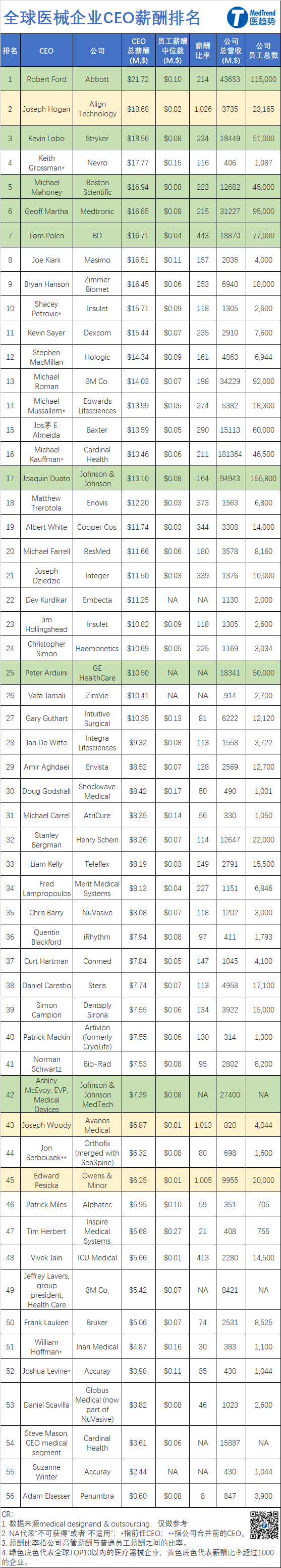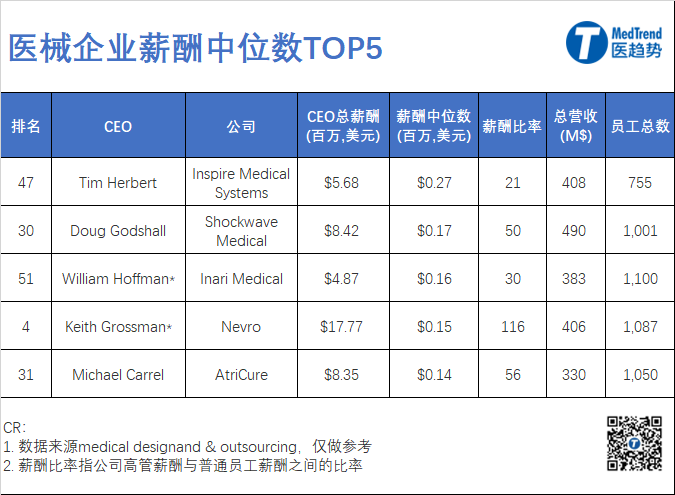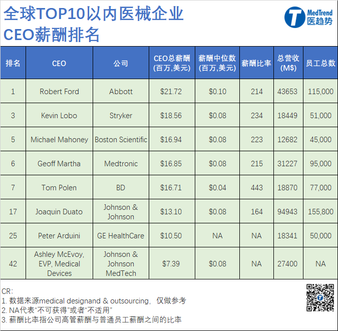 2022年,2022年标准普尔500上市公司中约有三分之二的高管在年底获得的实际薪酬低于其薪酬方案。医械企业似乎也不能幸免,目前多家械企CEO面临着降薪风险。 据统计,这51家械企员工薪酬中位数最高27万美元,最低却仅有不超过7000美元,14家公司的薪酬中位数达不到美国人均年薪水平(5.3万美元)。 数据涵盖了51家美国上市医械企业已经在美国证券交易委员会(SEC)披露的数据,其中,部分企业数据包括全球CEO数据以及医械业务CEO数据,如强生、3M、康德乐。 根据统计,全球医械TOP企业CEO的平均年薪为1060万美元;员工的平均工资中位数为7.6283万美元,提交代理委托书的公司的平均薪酬比率为219:1。 01CEO总薪酬: 最高2171万美元!多位CEO面临减薪压力 *该榜单依据企业提交给美国证监会的数据。西门子医疗、罗氏、飞利浦由于上市所在地在欧洲,不在统计范围内。 薪酬最高的CEO来自雅培。雅培CEO Robert Ford 2022年薪酬为2170万美元,占据榜首。不过,雅培是一家多元化公司,不仅仅生产医疗器械,它还拥有营养、体外诊断、以及制药部门。 美敦力董事长兼首席执行Geoff Martha在2022财年的总薪酬为1680万美元,在TOP10医械企业中,Geoff Martha的薪酬排名第4,低于雅培、史赛克以及波科三家企业CEO。 最近,美敦力宣布将减少Geoff Martha的工资,并改变其奖金结构。 当然,面临减薪的企业不止美敦力一家。近年来,医疗器械投资者对高管薪酬的审查也越来越严格。Masimo(总榜第8)、捷迈邦美(Zimmer Biomet,总榜第9)、汉瑞祥(Henry Schein,总榜第32)等公司在高管薪酬方案的“薪酬话语权”(say-on-pay)咨询投票中遭到了股东的抵制。 02打工人的“欢愁” 最高27万美元,最低6216美元 员工薪酬中位数在一定程度上反应了该企业员工的薪资水平。那么,哪些企业提供了更高的薪酬? 根据统计,员工平均薪资最高的企业有一定的共通性:员工总数在1000左右,总营收在3亿美元-5亿美元之间,都将相对较高的收入用于研发。 其中,