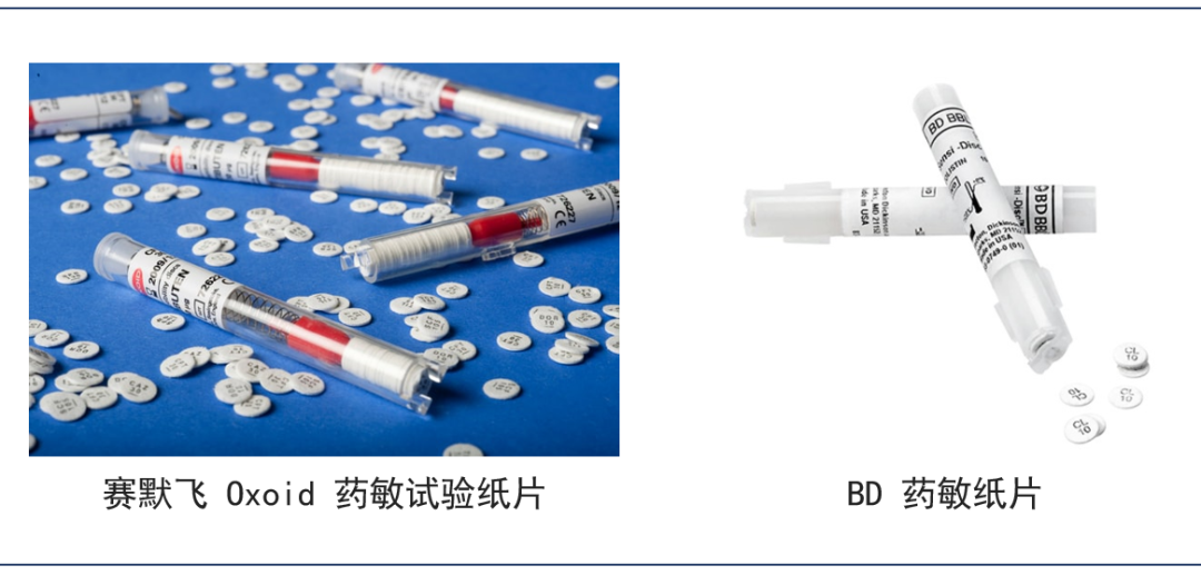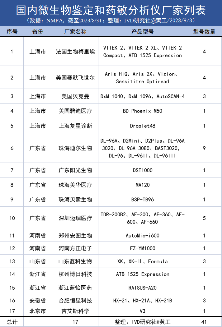 血培养仪,回答标本中,有无微生物的问题。微生物质谱仪,回答标本中,有没有以及是哪一种微生物的问题。临床微生物检测的最终目标,是治疗。因此,还需要知道,检测出的微生物,其药物敏感性如何。即通过药敏分析系统,得出微生物最低抑菌浓度值(MIC),根据CLIS的标准,得出相应药物敏感度:敏感S、中介I、耐药R三个结果。传统微生物鉴定仪原理,基于微生物标本各自的酶系统不同、新陈代谢的产物不同,以及相应底物生化反应的颜色变化不同,进行区分。一般来说,有四种技术:光电比色法、荧光法、数码鉴定法、质谱法。微生物鉴定和药敏分析系统,具体的工作原理及流程,可通过下方两个视频详细了解。到2023年8月,国内获批NMPA注册的微生物鉴定和药敏分析系统,共有17家41个型号。从型号数量整体来看,还是上海、广东两地为主。上海以进口的微生物4大家,广东以迪尔、迈瑞两家为主。当然还有其他省市的也有获批。△图12:国内微生物鉴定和药敏分析系统厂家和型号列表抗菌药物敏感性试验,AST,简称药敏试验。是指在体外测定抗菌药物抑制或杀灭微生物的能力。通过药敏试验,可以预测抗菌药物临床效果,进而指导临床医生选择合适抗菌药物。微生物药敏检测方法学,主要有三种:纸片扩散法(KB法)、E试验法和稀释法。对应的试剂盒,有药敏条、药敏板等。纸片扩散法,是指将含有定量抗菌药物的纸片,贴在已接种待检菌落的琼脂平板上,纸片中所含的药物吸取琼脂中的水分溶解后,不断向纸片周围扩散,形成递减的梯度浓度,在纸片周围抑菌浓度范围内,待检菌落生长被抑制,从而产生抑菌圈。抑菌圈大小,反映检测菌落对测定药物的敏感性。这是一种半定量方法。而E试验法,则是浓度梯度琼脂扩散试验。原理同扩散法。可直接测定受试菌的MIC。稀释法与E试验法,均可测定MIC值,是一种定量方法。(1)国外:法国生物梅里埃、美国BD、英国Oxoid(被Thermo Fisher收购),美国贝克曼、意大利Liofilchem,印度Himedia等。