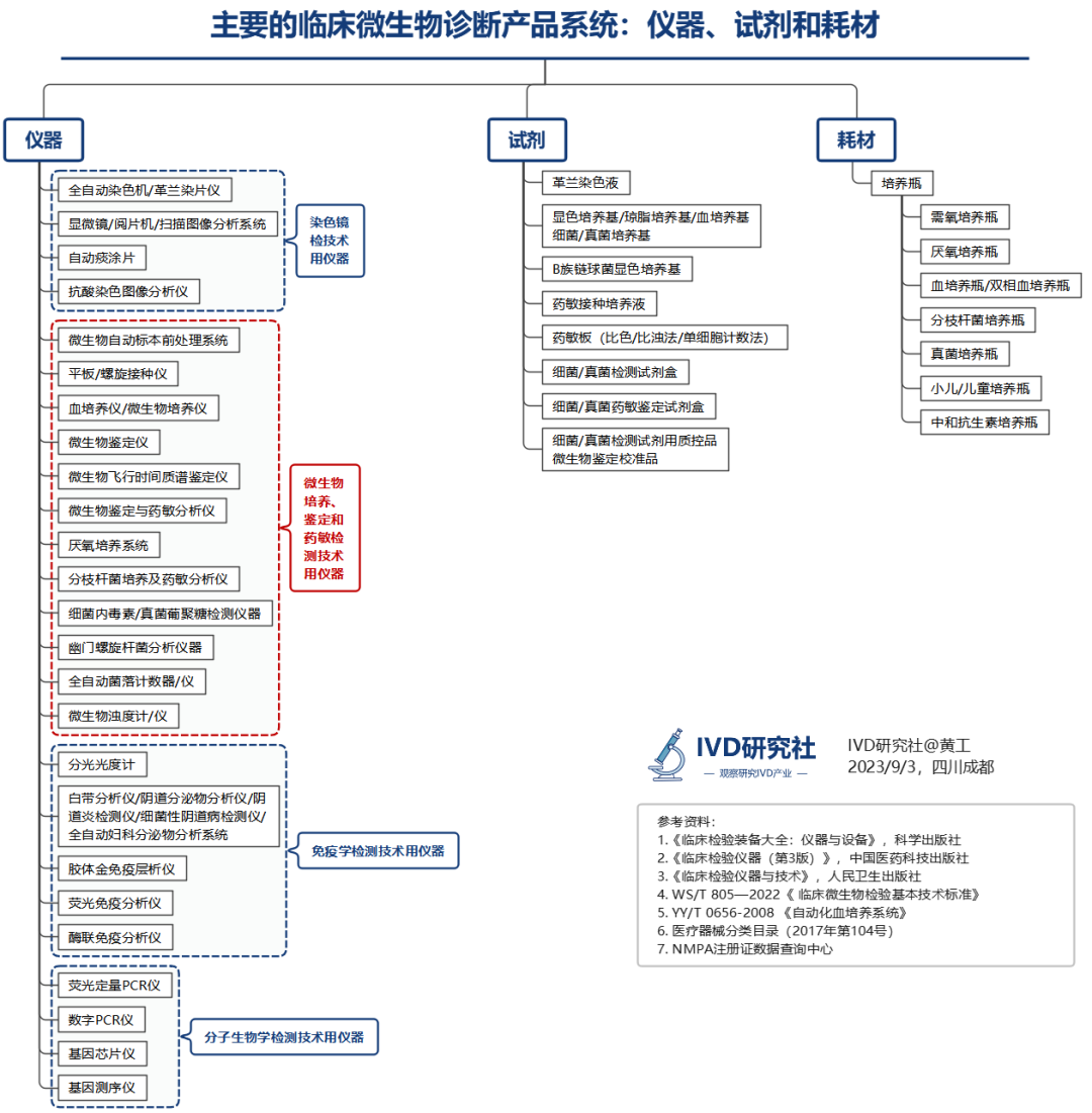国内临床微生物检测产业,近二十年来取得很大发展。从手工到半自动单机,再到全自动单机、流水线,国产厂家在崛起。微生物检验仪器,在所有IVD仪器序列中,自动化发展是较慢的一支。因为微生物标本来源丰富、种类多样、采集容器各异,在过去几十年里,很难建立统一的检测标准。检测标本有呼吸道、肠道、生殖道、无菌体液、组织标本等各种类型,与标本对应的前处理流程和培养基种类差异也很大。近年来,随着各类信息技术和先进制造工艺,与微生物检验技术的交叉渗透,微生物检测仪器变得更加先进了。和其他IVD仪器一样,微生物检测仪器,同样经历了从手工、半自动,到全自动、流水线、智能实验室的发展阶段。和生化、免疫 、分子、血球等常规仪器不同的是,微生物检验仪器,检测标本是微生物,而非人体细胞及细胞内物质。检测对象不同,检测方法也随之而异。《临床检验装备大全:仪器与设备》指出,引起人类感染的病原微生物,包括8大类:真菌、细菌、放线菌、支原体、螺旋体、立克次体、衣原体、病毒。前6种可用培养方法检测,根据临床需要做药敏试验;后2种难培养或不能培养,需用免疫学、分子生物学方法检测。见图1。微生物诊断产品,都有哪些?黄工综合行业标准、教材研报、业内文章,画了一张《微生物诊断产品系统图》(图2)。根据《临床微生物检验基本技术标准》(WS/T 805—2022),以及临床微生物专家观点,微生物检验技术,分成四大类:染色镜检;微生物培养、鉴定和药敏检测;免疫学检测;分子生物学检测。微生物检验仪器,主要解决:标本中,有无目标微生物?有的话,是哪一种,药物敏感性如何?(一)按检测方法学划分,有8大类,见图2。包括:自动标本前处理系统、血培养/微生物培养系统、微生物鉴定药敏分析系统、飞行时间质谱鉴定系统、分子检测系统、免疫分析系统、厌氧培养装置、自动染色仪。当然还有配套的,培养瓶、培养基、药敏测试板卡等耗材及相关检测试剂盒。(二)按NMPA医疗器械注册法规,传统微生物检测仪器分8大类。包括产品描述、预期用途、注册名称、管理级别等,见图3。2022年11月2日发布的《临床微生物检验基本技术标准》中,明确微生物检验基本技术包括染色技术、显微镜检查技术、接种技术、培养技术、鉴定技术、分子检测技术和免疫学检测技术等。以下图4、图5,是对分子、免疫检测技术特点的概述。△图5:微生物免疫学检测的标本类型、检测方法及技术特点