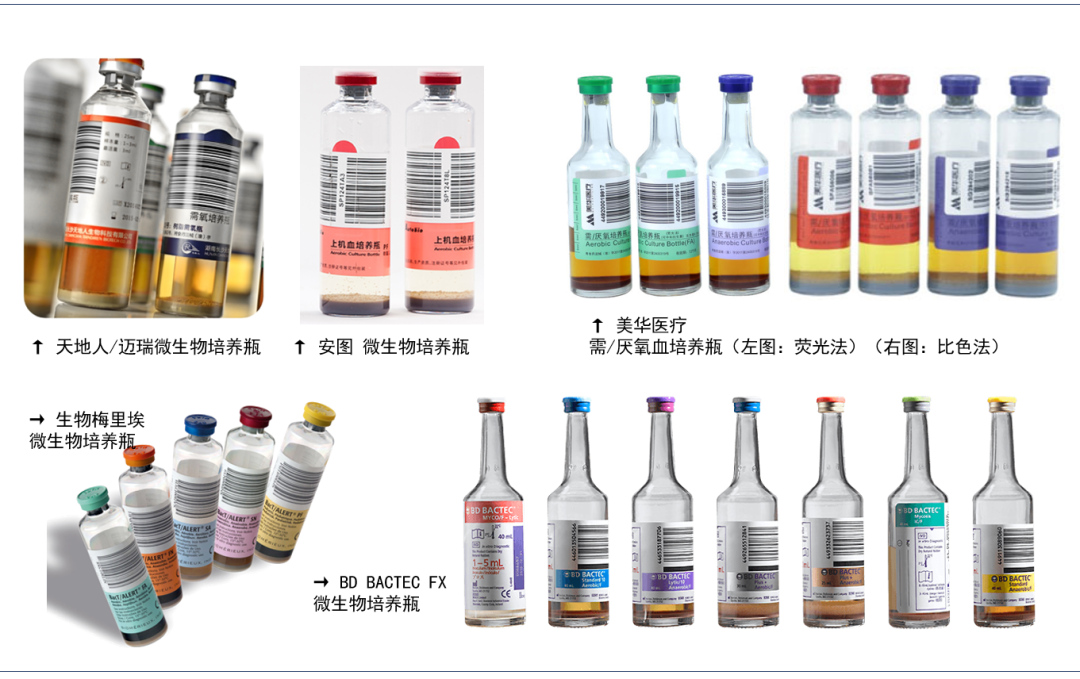 另外,还有与培养仪适配的重要试剂/耗材:培养瓶(图7)。主要类型有:需氧培养瓶、厌氧培养瓶、分枝杆菌/真菌培养瓶、双相血培养瓶、儿童血培养瓶等。培养瓶的核心组成,有两大部分:内置培养基和传感器,当然还有瓶身、瓶塞、瓶盖等。常见地,培养瓶材质有:PMMA(有机玻璃)或PC材质(聚碳酸脂)等,耐磨、耐高温、耐刮花、耐正负压强,还可透过透明罐身,观察培养皿生长情况和罐内气体环境变化。培养瓶平底,一般是平底、圆底类型。培养瓶内,主要是复合氨基酸和碳水化合物组成的培养基,以及O₂、CO₂、N₂混合气体填充。