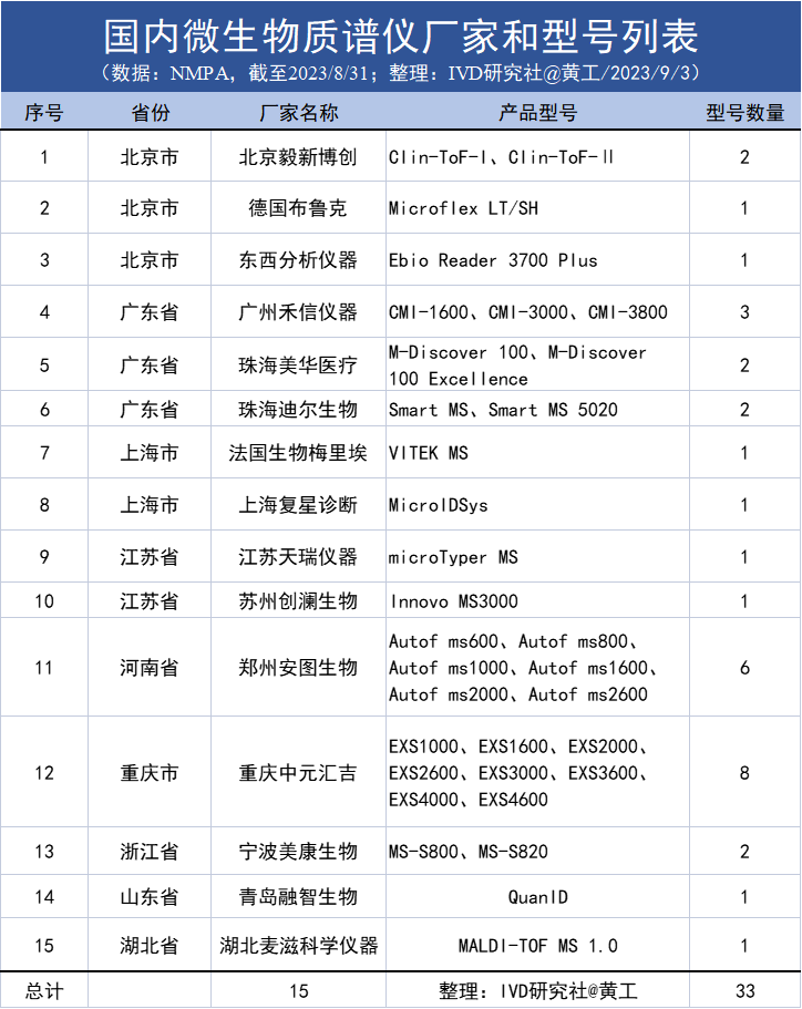 据不完全统计,到2023年8月底,国内获NMPA批准的微生物质谱仪,共有国内外15个厂家,共计33个型号。注册地,分布在北京、广东、河南、重庆等地。