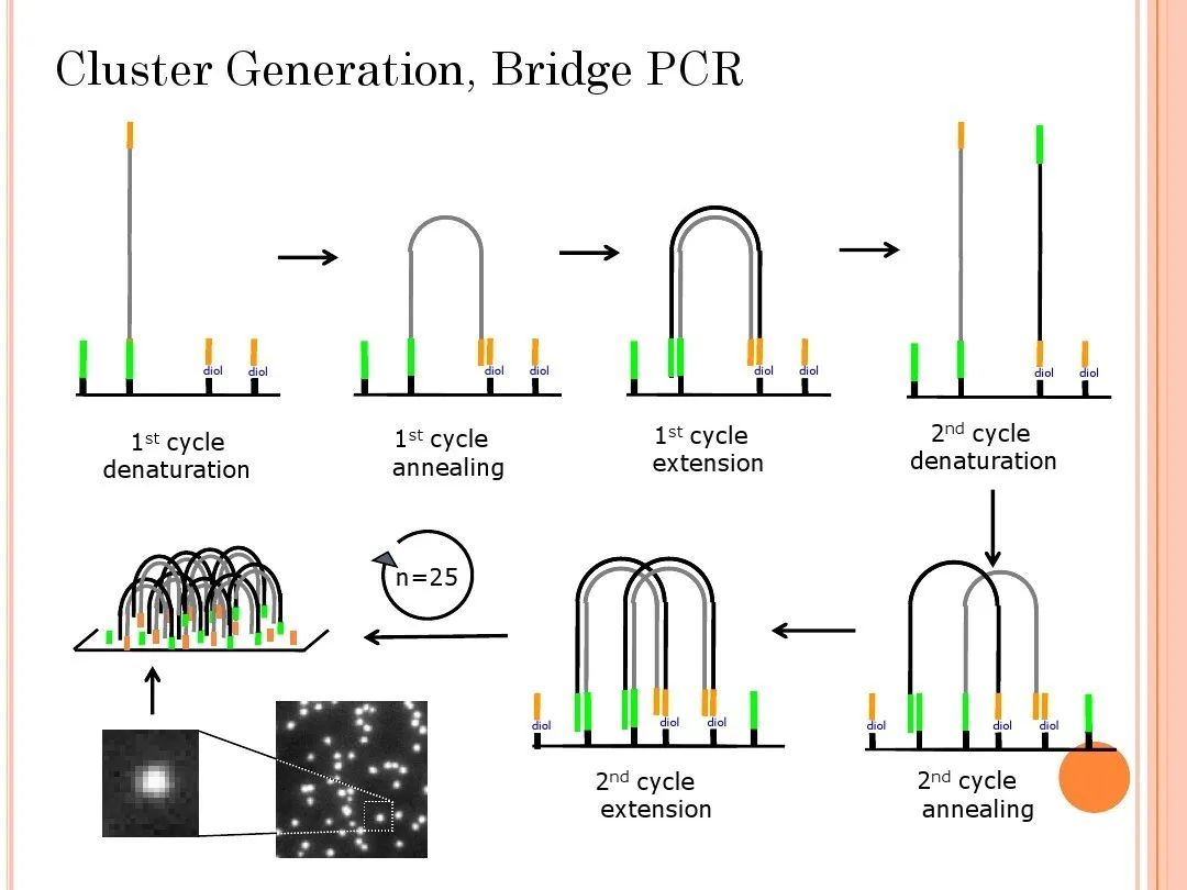 本篇内容,我们将进入到第二代测序也就是高通量测序的内容分享。包括: 随着历时13年耗资近3亿美元的人类基因组计划的完成,生命科学划时代地进入功能基因组时代。人们开始期待在基因图谱中找到疾病发生的确切机制,并实施精准的医疗计划。第一代测序技术虽然具有长读长和准确率高等优势,但其测序成本高、耗时久、通量低等缺陷使其不能满足大规模测序的需求。1996年Ronaghi 和Uhlen建立了焦磷酸测序。2005年454 Life Sciences公司推出了基于焦磷酸测序原理的Genome Sequencer 20系统。这在测序史上是具有里程碑意义的大事件,其改变了测序的规模化进程,成为第二代高通量测序的先行者。第二代测序技术的核心思想是边合成边测序,其最显著的特点就是高通量和自动化。不同于Sanger测序技术对模板进行克隆后进行单独反应,第二代测序技术将模板DNA打断成小片段并通过桥式PCR(或乳液PCR)对文库进行扩增,同时对几十万到几百万DNA模板进行测序。第二代测序技术的出现使得对一个物种的基因组和转录组进行深度测序变得不再遥远,其能够在保持高度准确性的同时,降低测序的成本,提高测序的速度。以人类基因组为3Gb计算,使用第一代测序技术,大概需要测序62500次才能完成人类基因组测序,每个反应按2小时计算,假设每天测序10次,每周工作7天,整个过程大约需要17年,而使用高通量测序技术仅需1周即可完成人类基因组测序。焦磷酸测序是一种由DNA聚合酶(Polymersae)、ATP硫酸化酶(ATP Sulfurylase)、荧光素酶(Luciferase)和三磷酸腺苷双磷酸酶(Apyrase)催化的新型酶级联化学发光测序技术。通过对DNA合成反应中释放的生物光信号完成实时检测,开创了边合成边测序的先河。反应底物为5’-磷酰硫酸(APS)、荧光素。在每一轮测序反应中,反应体系中只加入一种脱氧核苷酸三磷酸(dNTP)。如果它刚好能和DNA模板的下一个碱基配对,则会在DNA聚合酶的作用下,添加到测序引物的3’末端,同时释放出一个分子的焦磷酸(PPi)。在ATP硫酸化酶的催化作用下,生成的PPi可以和APS结合形成ATP,在荧光素酶的催化下,生成的ATP又可以和荧光素结合形成氧化荧光素,同时产生可见光。通过微弱光检测装置及处理软件可获得一个特异的检测峰,峰值的高低则和相匹配的碱基数成正比。如果加入的dNTP不能和DNA模板的下一个碱基配对,则上述反应不会发生,也就没有检测峰。 ATP和未掺入的dNTP由三磷酸腺苷双磷酸酶降解,开始新一个循环。2005年 454 Life Sciences公司基于将焦磷酸测序技术与乳液pcr及光纤芯片技术相结合,推出了Genome Sequencer 20高通量测序系统,发展大规模平行焦磷酸测序技术,实现了测序过程的高通量。 乳液PCR即油相包裹水相,利用油包水结构作为PCR反应的微反应器,进行PCR扩增,乳液PCR最大的特点是可以形成数目庞大的独立反应空间以进行PCR扩增。1、在PCR反应前,将含模板、dNTP、引物和DNA聚合酶的水溶液注入到高速旋转的矿物油表面,水溶液瞬间形成无数个被矿物油包裹的小水滴。2、这些“油包水”包被的磁珠表面含有与接头互补的DNA序列,单链DNA序列能够特异地结合在磁珠上。3、 在磁珠内含有PCR反应所需试剂,保证每个与磁珠结合的小片段都能独立进行PCR扩增,并且扩增产物仍可以结合到磁珠上。携带扩增DNA片段的磁珠被放入PTP板中进行测序。PTP板是一个60mm✖️60mm的光纤板,包含约160万个微反应器小室,每个小室(直径29μm)只能容纳一个磁珠(直径28μm),每个小室中都载有焦磷酸测序所需的各种酶和底物。随后4种dNTP依据T、A、C、G的顺序依次进入PTP板,开始测序反应,流程同焦磷酸测序一样。2007年 454 Life Sciences公司被Roche公司收购后又推出性能更优的第二代测序系统——Genome Sequencer FLX System。该系统读长超过400bp,10小时运行可获得100万条序列,4~6亿个碱基信息,且准确率达99%以上。 454 高通量测序系统在读长上具有明显的优势,使得后续的拼接工作更加高效和准确。是基因组从头测序、转录组分析、基因组结构分析等应用最理想的选择。但是由于使用的是焦磷酸测序原理,对瞬时发光进行检测,因此限制了其更大的通量,并且对于同聚物(连续数个碱基相同的序列)的检测不够准确,同聚物越长,可能产生的误差越大。除此之外,和其他高通量测序平台相比,共测序成本要高很多,在激烈的市场竞争中,并没有发挥出其先行优势。2013年Roche 公司宣布正式关闭 454测序业务。2007年Rothberg离开LifeSciences公司后立即创立了Ion Torrent公司,并开发出基于半导体芯片的新一代革命性高通量测序平台。Ion Torrent测序系统是第一个没有光学感应的高通量测序平台.IonTorrent测序是以半导体芯片为载体,通过检测DNA链在合成时释放H+从而引发的pH变化,把化学信号转变成电信号从而获取碱基信息的边合成边测序技术。1、 Ion Torrent测序系统同样运用了乳液pcr技术。测序反应发生在Ion Torrent芯片(一种布满小孔的高密度半导体芯片)上.每个小孔只能容纳一个测序珠子,孔底端有pH敏感型晶体管传感器,可检测孔内pH变化并将化学信号转变为数字信息。2、将准备好的测序珠子混悬液从芯片进口注入,对芯片离心以便更好地将单个测序珠子卡在单个小孔中。芯片上小孔数量越多,测序通量越大。3、 将分别含有A、T、C、G四种dNTP溶液分别依次流过芯片,若加入的dNTP与DNA链上碱基成功配对,此时会释放一个H+离子,导至小孔内p