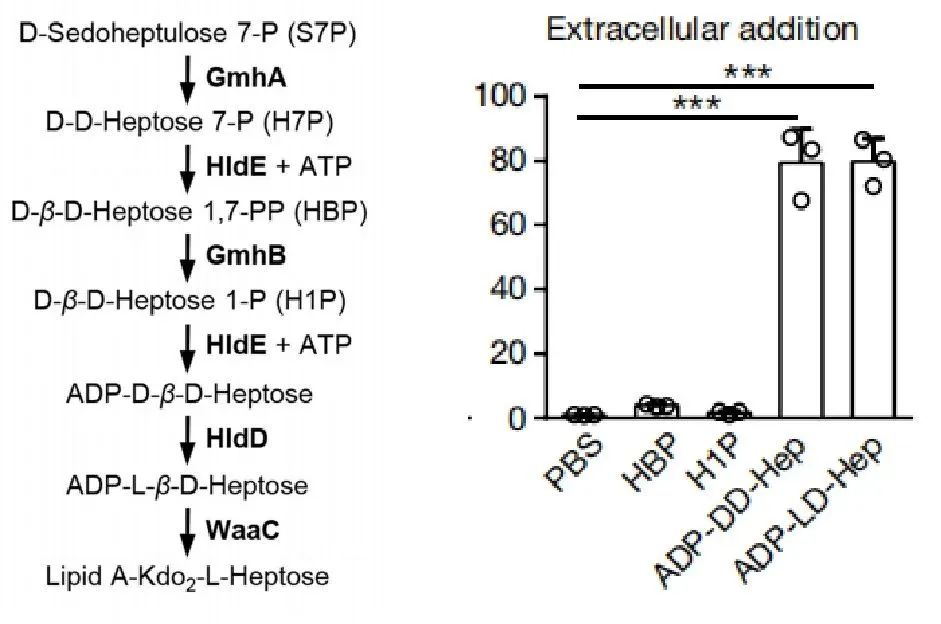 在哺乳动物中,宿主细胞通过模式识别受体(PRRs)精确辨别病原体相关分子模式( PAMPs),启动天然免疫反应并指导适应性免疫应答,从而抵抗病原微生物的入侵。模式识别理论被称作现代免疫学的基石之一,寻找和鉴定新的病原相关分子模式及其相应的模式识别受体是当代免疫学研究中“皇冠上的明珠”。 新的模式识别通路的发现,都会无一例外地开辟新的免疫学研究领域,从而促进人类对免疫系统与病原微生物互作机制的认知。 2018年8月,清华大学生物医学交叉研究院教授、北京生命科学研究所副所长邵峰院士团队在《Nature》在线发表题为(Alpha-kinase 1 is a cytosolic innate immune receptor for bacterial ADP-heptose)的研究论文,首次发现并证明细菌中ADP-heptose(二磷酸腺苷庚糖)进入宿主细胞后结合激酶ALPK1 N-端结构域,并刺激C-端激酶结构域磷酸化活化TIFA,介导III型分泌系统依赖的NF-κB的活化和细胞因子的产生。 此文系统证明了存在于革兰氏阴性菌和部分革兰氏阳性菌中的代谢产物ADP-heptose作为PAMP,能够透过哺乳动物的细胞膜,被作为PRR的广泛表达的ALPK1激酶识别,诱导细胞因子的产生,因此,ADP-heptose具有被用作免疫调节剂和疫苗佐剂的巨大应用潜力。 ADP-D-glycero-β-D-manno-heptose,简称ADP-heptose,中文名称:二磷酸腺苷庚糖,ADP-庚糖等,是细菌脂多糖(LPS)合成过程中的前体代谢产物,存在于革兰氏阴性菌和部分革兰氏阳性菌中。 此前有研究显示,细菌ADP-heptose生物合成通路中的前体分子庚糖-1,7-二磷酸(HBP)在被人为导入细胞后也可再诱导TIFA依赖的NF-κB活化,但研究者进一步发现,HBP不具有自主进入宿主细胞的能力,也不能直接激活ALPK1,但可以在细胞内被腺苷酰转移酶NMNAT活化为二磷酸腺苷庚糖-7-磷酸(ADP-heptose 7-P),二磷酸腺苷庚糖-7-磷酸能够直接激活ALPK1,但活性远低于ADP-heptose。相比HBP,ADP-heptose可以自主进入宿主细胞,激活ALPK1,且活性远远高于HBP。ADP-heptose-ALPK1天然免疫信号通路在抵御细菌感染过程中发挥重要作用,这一全新通路为相关疾病的药物研发提供了靶点。 图1 ADP-heptose和HBP激活宿主免疫反应的机制 图2 ADP-heptose可直接激活ALPK1,且活性高 ADP-heptose-ALPK1天然免疫信号通路在抵御细菌感染过程中发挥重要作用。鉴于ADP-heptose具有自主进入哺乳动物细胞的能力,因此,它也为开发新的免疫调节剂和疫苗佐剂提供了新的概念和方法。 为了更好的助力研究者们对免疫系统与病原微生物互作机制的认知,申基生物潜精研思,通过生物酶法体外催化合成制备ADP-heptose(货号:ADPHP001),并通过多环节把控产品质量,保障产品纯度≥95%!