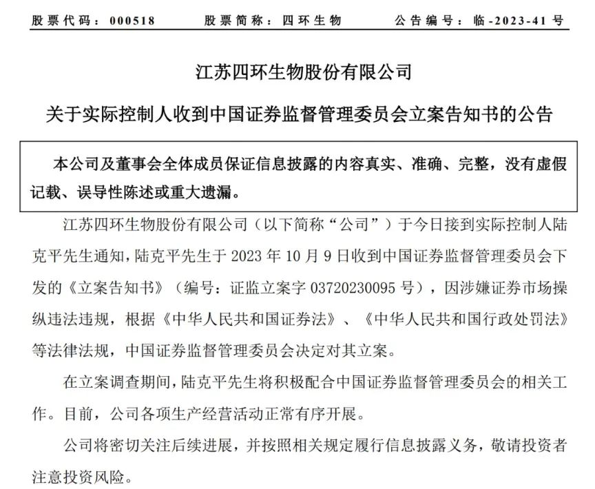 10月9日晚间,四环生物发布公告,公司接到实控人陆克平通知,陆克平收到中国证监会下发的《立案告知书》,因涉嫌证券市场操纵违法违规,根据相关法律法规,中国证监会决定对其立案。陆克平间接控股的江苏阳光也公告了这一内容。 四环生物方面,该公司是一家以生物医学技术及传统医药相结合的现代化药品生产企业,主营肝炎诊断试剂、注射剂、体外诊断试剂等。 四环生物、江苏阳光均表示,在立案调查期间,陆克平将配合中国证监会的相关工作。目前,公司各项生产经营活动正常有序开展。 资料显示,陆克平生于1944年,今年已经79岁。 资本大佬陆克平遭证监会立案 据公告,今年6月,江苏阳光披露,出于家庭内部安排,陆克平拟将江苏阳光间接控股股东江苏阳光控股集团有限公司(以下简称“阳光控股”)66.7925%的股权及对应全部权益转让给其儿子陆宇。 而相关手续若变更完成,江苏阳光的控股股东不变,实控人则会由陆克平变更为陆宇。 7月11日,陆克平持有的阳光控股6.5%的股权被工商变更至陆宇名下,陆克平持有的阳光控股60.2925%的股权转让手续在办理之中,尚未完成。同时,陆宇对阳光控股增资3.1亿元,持股比例为42.28%,已超过陆克平的持股比例。 针对立案调查的内容,江苏阳光表示,在立案调查期间,陆克平将积极配合中国证监会的相关工作。公司将持续关注上述事宜相关进度,并按照有关法律法规等的规定和要求,及时做好信息披露工作。目前,公司日常经营管理和业务状况正常。 四环生物也称,在立案调查期间,陆克平将积极配合中国证监会的相关工作。目前,公司各项生产经营活动正常有序开展。 此前被采取终身市场禁入措施 截至目前,四环生物实控人陆克平持有公司股份3.18亿股,累计质押股份数量2.86亿股,占其所持公司股份数量的90.04%,质押比例较高。 而实际上,陆克平曾通过他人股票账户持有四环生物股票,此事之前也曾遭到证监会的立案调查。 根据调查结果,2014年起,陆克平以扩大其控制的四环生物股东大会表决权数量为目的,自行或通过他人找来陆宇、郁琴芬等13个证券账户和2个权益工具。陆克平拥有上述13个证券账户和2个权益工具的控制权及上述账户所持四环生物股票表决权,并通过其实际控制的江苏阳光集团有限公司(以下简称“阳光集团”)及其他银行账户转账、直接存入现金等方式向上述账户提供资金。 陆克平控制上述13个证券账户和2个权益工具在2014年2月20日至2018年4月11日交易四环生物股票,同时通过上述账户在四环生物股东大会上行使表决权。 其次,陆克平控制的阳光集团办公场所内有四环生物及其子公司的生产经营事项及财务事项的资料。最后,部分涉案人员指认陆克平为四环生物实控人,并承认其向陆克平汇报工作,四环生物的重大经营决策由陆克平决定。 根据调查结果,陆克平不晚于2014年5月23日成为四环生物实控人,且其在2014年5月23日至2018年4月11日期间实际控制四环生物。四环生物在2014年至2018年年度报告中披露“无实际控制人”等关于公司实际控制人的信息存在虚假记载。 而在此期间,四环生物子公司新疆爱迪新能源科技有限公司与陆克平控制的阳光集团子公司江苏阳光置业有限公司还发生过关联交易,四环生物也未按规定披露。 根据调查结果,陆克平被证监会处以罚款、警告和终身市场禁入措施。 10月9日,四环生物跌1.05%,报2.83元/股,总市值29.14亿元。从市值上看,陆克平在四环生物损失惨重。 |