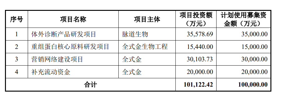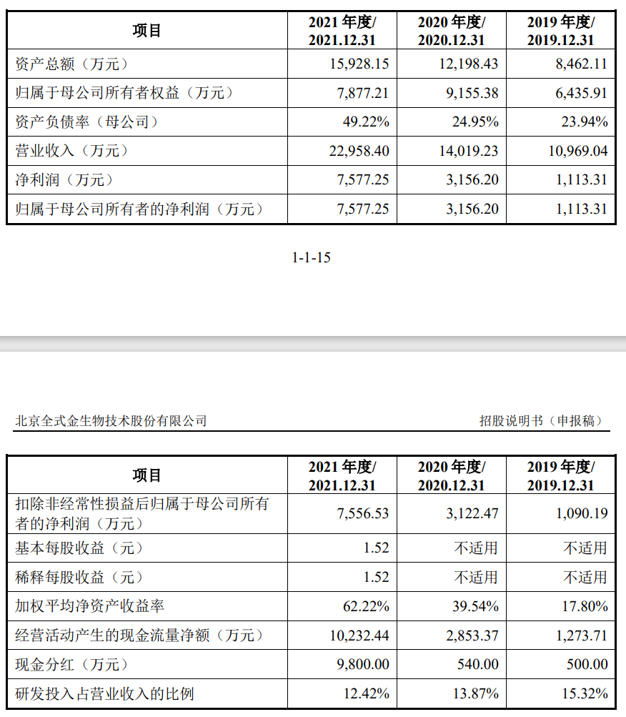 断试剂的研发、生产、销售的生物科技企业。全式金生物扎根于生命科学领域的生物试剂行业,产品已被广泛应用于生命科学研究、医学研究、新药研发、技术服务、体外诊断等领域。全式金生物发行上市申请适用《上海证券交易所科创板股票上市规则》第2.1.2 条第(一)项的规定,即预计市值不低于人民币10亿元,最近两年净利润均为正且累计净利润不低于人民币5000万元,或者预计市值不低于人民币10亿元,最近一年净利润为正且营业收入不低于人民币1亿元。 全式金生物此次IPO原本预计募集资金10亿元,资金用途如下:财务方面,2019年、2020年和2021年,全式金生物营业收入分别为 1.10亿元、1.40亿元和2.30亿元,实现归属于母公司股东的净利润分别为1,113.31 万元、3,156.20万元和7,577.25万元,主营业务毛利率分别为78.54%、80.00%和81.46%。
