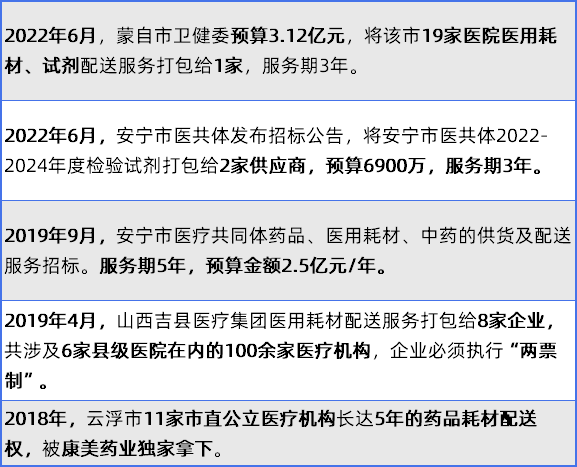 近日,安宁市第一人民医院发布了《安宁市医疗共同体医用耗材(含诊断试剂)SPD精细化管理服务采购项目招标公告》,该项目分三个标段,服务期限为5年,为全县10家医院医用耗材集中配送,公开招标3家具有较强实力的药械流通企业。 然而就在公告发布五天后,安宁市第一人民医院再次公告,该项目终止了! 因服务需求变更,终止本项目的招标工作。 据采购公告了解,本次采购主体为安宁市医疗共同体,旗下拥有10家医疗机构,包括2家三级医院:安宁市第一人民医院、安宁市中医医院,6个卫生院:八街、县街、青龙、草埔、太平、禄脿,2个社区卫生服务中心:金方、连然。 一标段第1、2年度预算不确定,但第3年起预算达10500万元/年,3年期限合约高达3.15亿元;二三标段每年采购预算达4500万元,5年期限高达2.25亿元。整个项目量级至少在5.4亿以上! 无独有偶,10月16日,中国政府采购网发布《文山市紧密型医共体检验试剂、检验耗材配送综合服务采购项目终止公告》。这一1.2亿的耗材配送大单也被终止了! 因项目采购计划发生实质性改变,现需终止该项目的招标工作。 此项目的采购主体文山市紧密型医共体,旗下覆盖4家市直医疗卫生单位、4个社区卫生服务中心、14家乡镇卫生院。 本次招标内容主要是为文山市医共体的22家医院遴选耗材试剂配送商:4000万元/年,服务期限3年,预算高达1.2亿元! 配送范围包括:医共体各医院使用的所有检验试剂及耗材(包含检验科、病理科、输血科试剂及耗材;临床药学科使用的血药浓度、药物基因检测试剂及耗材。 近期内,两个同类型、规模上亿的SPD大单接连终止,原因也存在一定类似,也不知是否为巧合… 数十家医院耗材试剂打包给1-3家企业,这样的医用耗材集采集配模式,如今正以惊人的速度在全国遍地开花。 不只是安宁市、文山市,9月21日,《云县医共体区域检验中心建设项目合作伙伴招标招标公告》下发,云县人民医院为全县216家医疗机构五年的试剂耗材集中配送,公开招标1家供应商。 这261家机构,包括4家县级机构、12个乡镇卫生院、194个村卫生室和6所民营医院。 今年6月,南县卫健局为全县20家医院医用耗材集中配送,公开招标1家具有较强实力的药械流通企业,3年耗材采购配送打包,预算金额高达7000万元。 更早之前,山西吉县医疗集团医用耗材配送服务打包给8家企业,共涉及6家县级医院在内的100余家医疗机构…… 近几年,县域医疗市场耗材采购配送打包,开始渐成趋势,云县、南县、崇州市都只是中国当下县域耗材市场一个小小的缩影。 我国医院百强榜中,已有53家医院落地实施SPD项目,头部医院SPD渗透率已超过50%,且速度不断加快。以百强医院作为风向标,县域医院SPD服务也快速推开,目前SPD项目中二级医院占比已经突破30%。随着紧密型县域医共体的爆发,县域医疗机构打包耗材采购已经开始遍地开花。 县域耗材市场变革! 经销商淘汰赛全面开启 据国家卫生健康委消息,截至目前我国已经在800多个县(市、区)试点建设紧密型县域医共体。国家对县域医共体的大力推进,也为耗材SPD服务模式在县域医院的遍地开花,提供肥沃的土壤。 巨大的县域市场,无论是大型药械流通企业,还是中小经销商本都有机会一较高下。但从政策层面,县域医疗市场耗材采购模式却迎来巨大变革。 紧密型县域医共体内药品、耗材统一招标、配送,对供应商资质要求均大幅提升:经营能力强、实力雄厚、信誉好。对于仓储能力、物流配送能力、资金以及管理能力的要求,更并非一家中小企业能够企及。 此前崇州全市18家公立医院耗材被4家供应商打包:该项目4个包,最终由重庆医药集团四川医药有限公司、重庆医药集团四川供应链管理有限公司、国药集团西南医药有限公司、四川海王医疗科技有限公司这4家大型流通企业拿下。 这18家医院,仅3家是市级,其余15家均为基层医疗机构。在其招标文件中,我们能看到对中选企业的标准是:经营能力强、实力雄厚、信誉好。 无独有偶,其他众多医共体打包项目,也纷纷由少数或一家巨头拿下。 耗材SPD服务模式下配送商数量被全面缩减,毫无疑问,在爆发的县域市场,大型流通企业将通过资源聚拢、优势整合、高效运营,不断把大量医院配送项目收入囊中,疯狂跑马圈地。 |