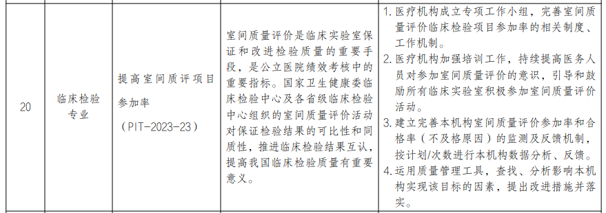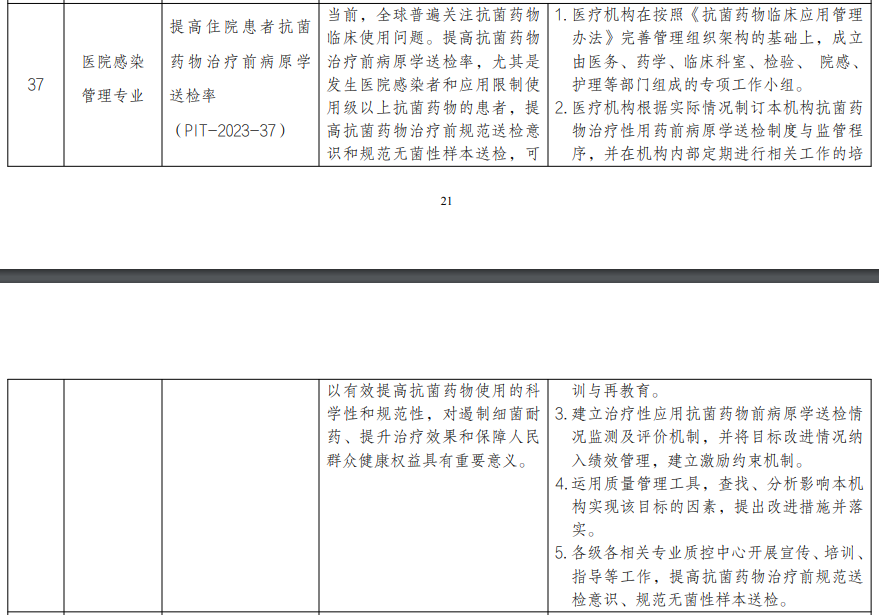(1)感染科:提高呼吸道病原体核酸检测覆盖率和呼吸道感染性疾病核酸检测百分比! 呼吸道传染病是全球重大公共卫生问题,早期从发热和(或)呼吸道症状患者中正确识别并明确病原学诊断是呼吸道传染病防控的关键环节。医疗机构应当开展呼吸道病原体检测技术,医务人员应当熟练掌握呼吸道传染病的临床特点、标本采集和病原学检测技术。 室间质量评价是临床实验室保证和改进检验质量的重要手段,是公立医院绩效考核中的重要指标。国家卫生健康委临床检验中心及各省级临床检验中心组织的室间质量评价活动对保证检验结果的可比性和同质性,推进临床检验结果互认,提高我国临床检验质量有重要意义。(3)人体器官分配与共享计算机系统:提高人类白细胞抗原分型检测率 (PIT-2023-29) 人类白细胞抗原(HLA)分型,是用于确定个体免疫系统类型的过程,是器官移植过程的重要步骤之一。HLA 配型用于匹配器官捐献者和移植等待者的免疫系统,以降低免疫排异的风险。提高 HLA 分型检测率有助于提高器官捐献者和移植接受者之间的匹配程度,从而降低器官移植接受者排斥反应及其他并发症,有助于提高移植接受者的生活质量和术后生存时间。(4)医院感染控制专业:提高住院患者抗菌药物治疗前病原学送检率 (PIT-2023-37) 当前,全球普遍关注抗菌药物临床使用问题。提高抗菌药物治疗前病原学送检率,尤其是发生医院感染者和应用限制使用级以上抗菌药物的患者,提高抗菌药物治疗前规范送检意识和规范无菌性样本送检,可以有效提高抗菌药物使用的科学性和规范性,对遏制细菌耐药、提升治疗效果和保障人民群众健康权益具有重要意义。
