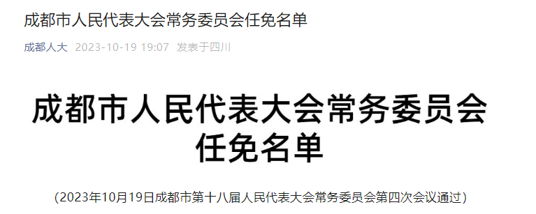 10月19日,成都市第十八届人民代表大会常务委员会第四次会议通过,决定免去:杨晓涛的成都市医疗保障局局长职务;决定任命:杨晓涛为成都市卫生健康委员会主任。