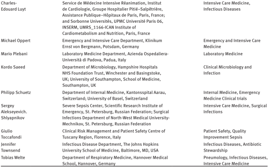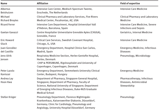2018年9月下旬,在柏林1天的工作时间达成了共识过程。这个过程有来自12个国家的19名多学科专家团队参与,对PCT使用的临床实践形成了共识。他们在医院ABS 程序中不同功能利益关联者,如:重症监护医学(医学和外科监护二者)、急诊医学、呼吸医学、临床微生物和感染疾病、药剂学、病人安全和检验医学(见表1)。