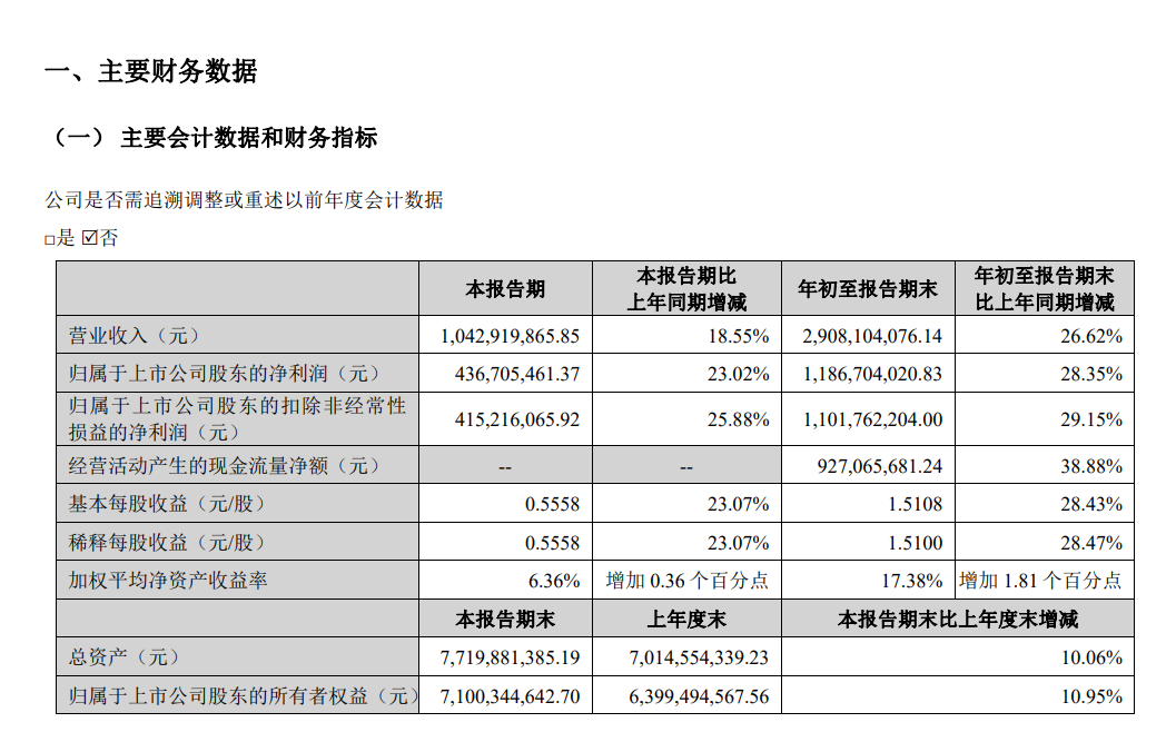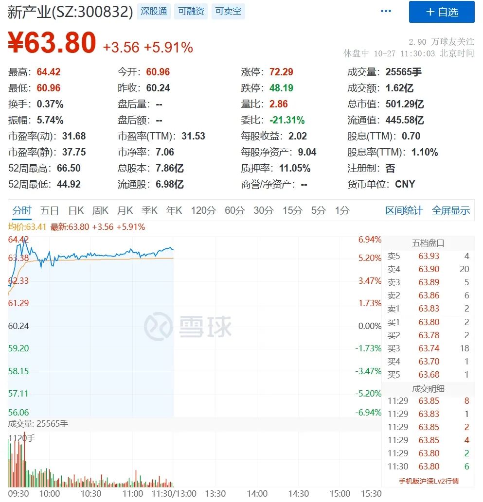 新产业前三季度总营收29亿,同比增长26.6%;净利润11.8亿,同比增长28.3%。