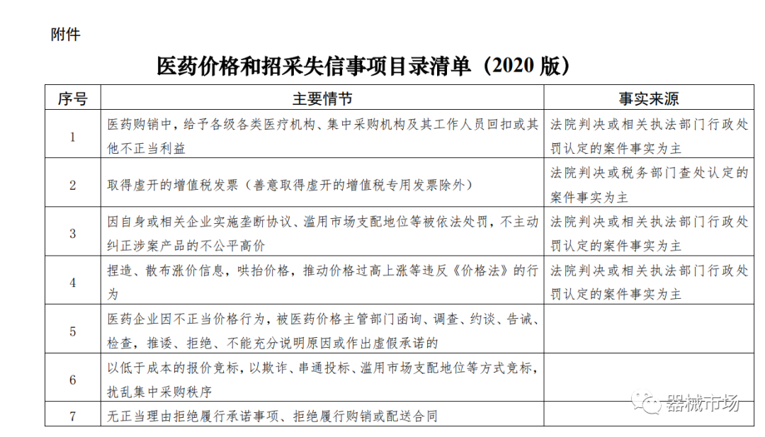 国家医疗保障局建立医药价格和招采失信事项目录清单,实行动态调整,列入目录清单的失信事项主要包括在医药购销中给予回扣或其他不正当利益(以下简称“医药商业贿赂”)、涉税违法、实施垄断行为、不正当价格行为、扰乱集中采购秩序、恶意违反合同约定等有悖诚实信用的行为。