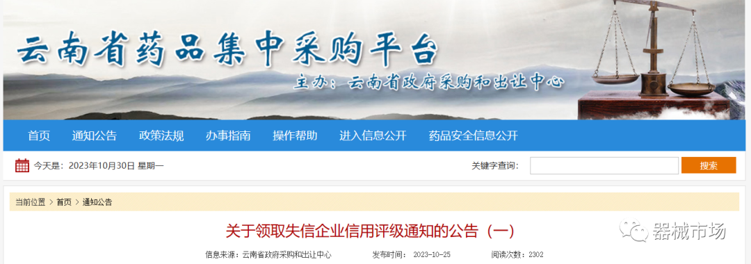 2023年10月25日,云南省药品集中采购平台发布《关于领取失信企业信用评级通知的公告(一)》,公布涉案的八家企业。