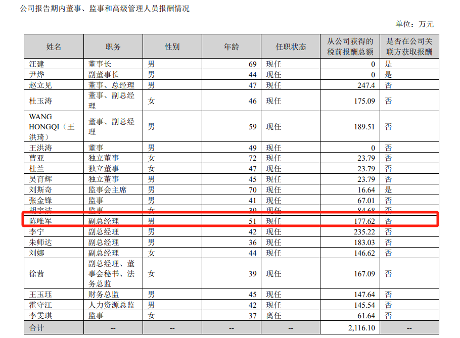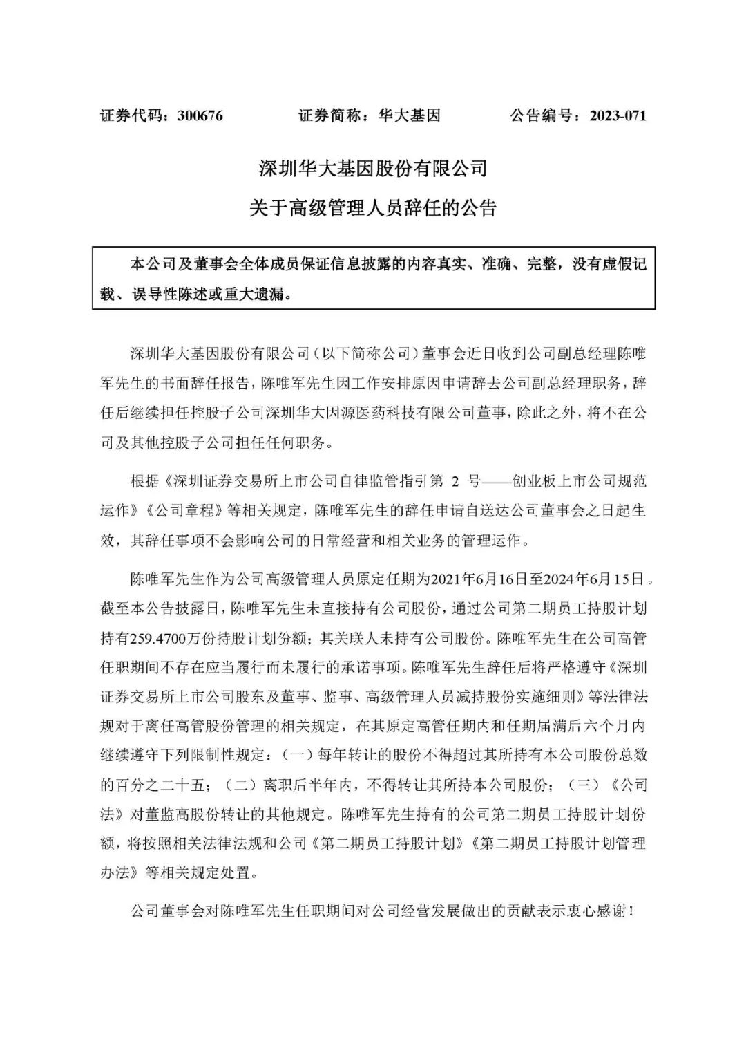 军先生的书面辞任报告,陈唯军先生因工作安排原因申请辞去公司副总经理职务,辞任后继续担任控股子公司深圳华大因源医药科技有限公司董事,除此之外,将不在公司及其他控股子公司担任任何职务。陈唯军,男,1972 年出生,中国国籍,无境外居留权。博士。现任华大基因副总经理、感染防控事业部负责人。曾任华大控股副总经理,北京华大吉比爱生物技术有限公司副总经理。2022年度薪酬为177.6万元。