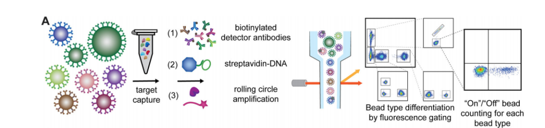 • 荧光标记的DNA探针与RCA产物杂交,允许通过流式细胞仪器计数“开”和“关”的珠数