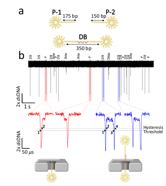 在检测时,流星型核酸链P1和P2通过纳米孔电信号间隔大,哑铃型核酸链DB通过纳米孔信号间隔小,结合检测到的电信号变化和加入核酸链浓度可以计算得到待检测物质浓度。