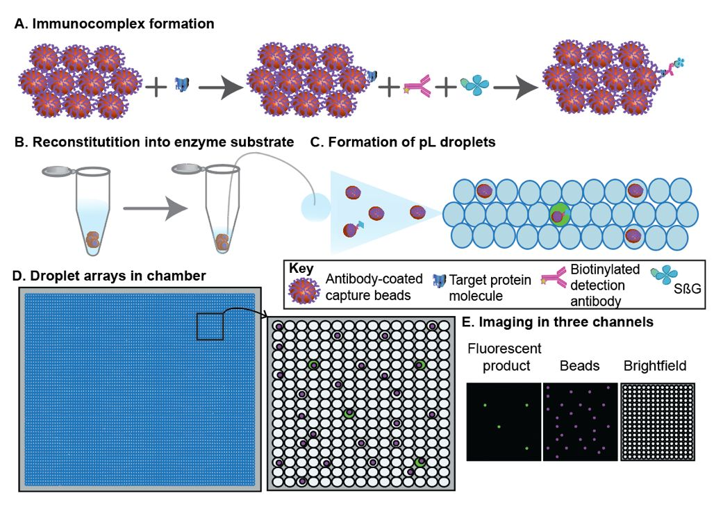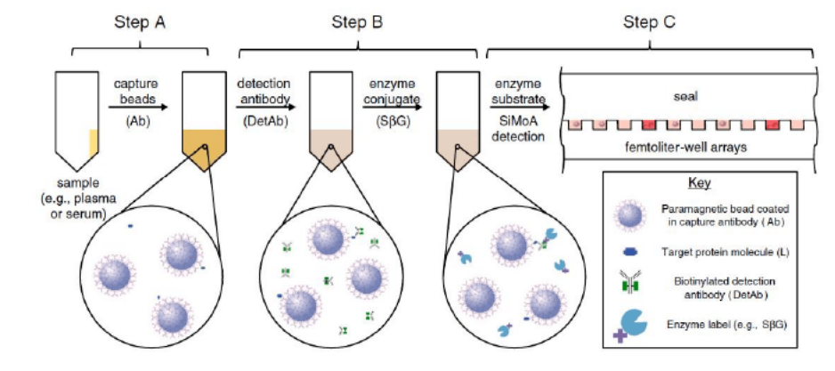 SiMoA通过磁珠酶联免疫反应与微孔阵列芯片的结合,实现单分子蛋白检测。其操作流程如上图