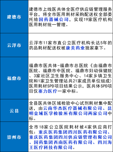 20家医院耗材试剂配送,1家包了! 近日,《云县医共体区域检验中心建设项目合作伙伴招标评标结果公示》发布。 云县人民医院为全县医共体区域检验中心检验、输血、病理所有试剂、耗材配送,公开招标1家供应商,服务期长达5年。中标结果显示,由云南盛时迪安生物科技有限公司独家中标。 云县医共体成员包括云县人民医院、云县中医医院、云县疾病预防控制中心、云县妇幼保健计划生育服务中心、全县12个乡镇卫生院、194个村卫生室和6所民营医院,合计20家医院,216家医疗相关机构。 216家机构5年的试剂耗材配送,全部打包给1家企业,这个体量可以说是非常可观了。 近期医共体耗材试剂打包,企业独家中标的不在少数。 前不久,云南省公共资源交易平台发布了《石屏县人民医院紧密型医共体检验试剂、耗材配送服务采购项目中标公告》。 该项目预算4500万元,为医共体检验试剂、耗材配送公开遴选供应商,服务期三年。最终国药控股红河有限公司以4455万元独家拿下该项目。 石屏县人民医院紧密型医共体以石屏县人民医院为牵头医院,包括县疾控中心、县妇幼保健院和4家乡镇卫生院。 9月14日,《杭州市余杭区第三人民医院医共体医用耗材集中配送服务项目采购项目结果公告》下发,其显示:中标人为浙江省医疗器械有限公司1家供应商。 余杭区第三人民医院医共体共计8家医疗机构:余杭区第三人民医院和良渚街道、仁和街道、瓶窑镇、径山镇、黄湖镇、鸬鸟镇、百丈镇七家社区卫生中心。也就是说,这8家医院未来三年的试剂耗材配送将由其1家公司独揽。 新型SPD模式异军突起 近几年,县域医疗市场耗材采购配送打包,开始渐成趋势。尤其今年以来,这种联合打包模式的扩围再迎提速。 除了上述的石屏县、余杭区和云县,5月17日,《南县血防专科医医院及19家乡镇(中心)卫生院医用耗材集中配送服务采购公告》下发,南县卫健局为全县20家医院医用耗材集中配送,公开招标1家具有较强实力的药械流通企业,3年耗材采购配送打包,预算金额高达7000万元。 9月-10月,禄丰市人民医院对《禄丰市紧密型医共体普通耗材采购项目》进行招标;安宁市医疗共同体、文山市紧密型医共体都曾为医共体耗材试剂配送公开遴选服务商;蒲江县医共体为县内13家公立医疗机构的耗材、药品SPD项目发布调研公告…… 在大批全县/全市公立医院耗材采购配送被打包的趋势下,大型药械流通商已经开始全面攻城略地。时至今日,县域、二级医院的配送权也正以惊人的速度走向集中化。 从中国政府采购网部分中标数据中,我们能看到在大量县域医院、二级医院采购项目中,国药、上药、华润等流通巨头及其子公司,直接包揽了数家二级医院未来3-5年医用耗材配送市场,而以往这本是中小型经销商的“主场”。 县域耗材流通市场巨变! 经销商淘汰赛全面开启...... 县域耗材市场,为何成为药械流通企业争夺的重点呢? 根据国家卫健委最新数据,截至2022年底,我国共有17555家县级医院。按“千县工程”规划,到2025年,至少1000家县医院达到三级医院医疗服务能力水平。 在国家多项政策推动县域医院升级的大潮流下,县域耗材设备市场迎来全面爆发。 与此同时,其耗材采购模式更迎来巨大变革。国家卫健委印发的《关于推进紧密型县域医疗卫生共同体建设的通知》《关于开展紧密型县域医疗卫生共同体建设试点的指导方案》等文件中,明确要求医共体实行药品耗材统一管理,统一用药目录、统一采购配送、统一支付货款。 据悉,截至目前我国已经在800多个县(市、区)试点建设紧密型县域医共体。随着医共体建设的不断推进,县区基层SPD项目的建设,无疑是下一个主攻战场。 而紧密型县域医共体内药品、耗材统一招标、配送,对供应商资质要求均大幅提升:经营能力强、实力雄厚、信誉好。对于仓储能力、物流配送能力、资金以及管理能力的要求,却并非一家中小企业能够企及。 不仅是近期的石屏县等项目,其他众多医共体打包项目,也纷纷由少数或一家巨头拿下。 耗材SPD服务模式下配送商数量被全面缩减,毫无疑问,在爆发的县域市场,大型流通企业将通过资源聚拢、优势整合、高效运营,不断把大量医院配送项目收入囊中,疯狂跑马圈地。 |