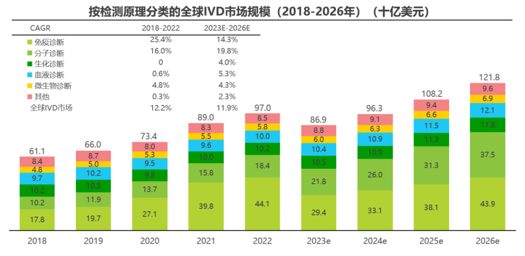 体外诊断IVD丨研究报告 市场概述: 概念剖析:体外诊断(IVD)指在体外检测来自人体的样本(血液、体液、组织等),以获取临床诊断信息,诊断疾病或身体功能。被誉为“医生的眼睛”,是现代检验医学的重要构成部分。 类别梳理:根据检验方法或技术,IVD产品可分为免疫诊断、生化诊断、分子诊断、血液诊断、微生物诊断五个主要类别。根据使用场景,IVD产品可分为POCT和实验室Lab两类。 市场规模:2022年全球IVD行业规模970亿美元,预计未来四年全球IVD行业规模将以11.9%的CAGR增长,2026年将超1200亿美元。 热点赛道: 化学发光:化学发光是目前在免疫诊断中最为先进的技术手段。应用项目包括肿瘤标识物、甲功、传染病、激素、心脏标识物等。2022年全球化学发光市场规模约147亿美元,占免疫诊断市场的33.3%。 POCT:POCT主要应用于血糖检测类、血气电解质类、心血管检测类、感染性疾病类、妊娠检测类和其他检测类(包括血常规等)。2022年全球POCT市场规模达到367亿美元,且将因疫情因素于2023年面临回调,其后以15%-20%的增速持续上涨。 PCR:PCR聚合酶链式反应技术是分子诊断技术中应用最广的技术。如今在感染性疾病、肿瘤、遗传病等医疗领域获得了广泛应用。2022年全球分子诊断市场规模达到184亿美元,预计于2026年达到375亿美元。 集采风起: 集采原因:技耗分离后,决定最终收费高低的,是体外诊断试剂集采价格的高低。故IVD集采承担着缓解医保压力和规范化市场秩序两大任务。 现存难点:各厂家的检测系统一致性难以得到保证,会对临床判断产生很大的不良影响;化学发光的仪器与试剂多为强绑定关系,若强行集采,医院将会造成大额成本支出。 变化与破局:竞争格局方面,各厂商业绩表现同集采中标情况呈现强相关态势。商业模式方面,集采使得可供医疗机构与厂商、代理商重新分配的费用得到控制与切割。企业破局主要方式包括:前移应用市场至C端、加大对全流程服务的重视程度、布局上游提升原材料的议价能力,把控和代理商之间的成本分配、探寻海外市场机会等。 趋势洞察: 发展中国家IVD市场呈现基数小、增速高的特点,将成为未来国内IVD厂商的出海主方向。 TLA成为IVD技术自动化水平提升的重要基石,国内TLA企业有望凭借高性价比与强兼容性迎来发展新机遇。 IVD是一种医学检测方法,在现代医学中发挥着重要作用 体外诊断(IVD)是一种医学检测方法,它在体外检测来自人体的样本(血液、体液、组织等),以获取临床诊断信息,诊断疾病或身体功能。通过IVD试剂与人体样本之间的反应,可以给出定性或定量诊断,并与正常值进行比较,以判断患者的生理状态。体外诊断在医疗领域被誉为“医生的眼睛”,是现代检验医学的重要构成部分,在临床应用中贯穿了疾病预防、初步诊断、 治疗方案选择、疗效评价等疾病治疗的全过程,能够为医生提供大量有用的临床诊断信息,越来越成为人类疾病诊断、治疗的重要组成部分,在现代医学疾病诊断中发挥着重要作用。 中国IVD行业发展回顾 经过近40年的发展,中国IVD产业正处于广泛应用阶段 随着民众对于IVD检验方法及产品的接受度不断提高、政府对于市场的规范力度逐步增强,我国IVD行业已历经孕育萌芽期、探索规范期、高速发展期、升级取代期四个主要阶段,目前正处于广泛应用期,长期发展态势喜人。 IVD产品的应用 IVD产品应用广泛,覆盖从常规检查到危重病、从个人到医疗机构全场景 IVD产品的应用范围非常广泛,不仅可以用于诊断各种疾病,同时还能够在生命科学研究、体育医学、环境监测、食品安全等领域发挥重要作用。回归于医疗领域,通常情况下,可以将IVD产品根据疾病类型以及终端用户的类型进行两种不同的分类。基于疾病,IVD产品可以覆盖从常规检查到危重病等多种情况,包括常规检查和慢性病、传染病、妊娠、遗传疾病、肿瘤等。基于终端用户,IVD产品可以覆盖从个体到医疗机构等多种场景,包括个人、非营利组织(如CDC、血站、学院等)和医疗机构(主要是医院和实验室)。综合而言,IVD产品辐射了临床的各个阶段,贯穿于初步诊断、治疗方案选择、有效性评价、确诊治愈等疾病治疗全过程,且随着研究的深入与技术的进步,未来IVD产品将会有更多的应用可能性。 按检测原理分类 免疫诊断与分子诊断技术更迭速度快、应用广泛,广受市场关注 根据前文所述,IVD可根据检测原理大致分为五类。其中生化诊断目前技术较为成熟,临床应用广泛;免疫诊断市场占比最高,未来将由化学发光引领新一轮技术革新与体量增长;分子诊断近年来增速较快,主要以二代基因测序为主,在肿瘤早筛领域极具发展空间;微生物诊断与血液诊断占比较低,增长空间有限。 全球IVD的市场规模:按检测原理划分 免疫诊断是目前IVD市场最大的细分市场,分子诊断保持稳步增长 整体而言,全球IVD市场规模增长速度喜人,目前已达970亿美元,虽然随着新冠疫情基本结束、疫情防控全面放开等因素影响,IVD市场会于2023年面临一定程度的回调,但仍有望于2025年突破1000亿美元。细分来看,免疫诊断可应用于传染病、内分泌、肿瘤、药物检测等领域,是目前IVD市场中最大的细分市场,占比高达45.5%;另外分子诊断在PCR技术的加持之下,将持续保持高速增长,预计会在5年左右同免疫诊断呈现“分庭抗礼”的局面。 按使用场景分类 Lab和POCT术业有专攻,分别解