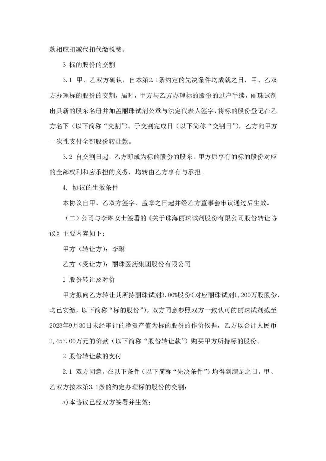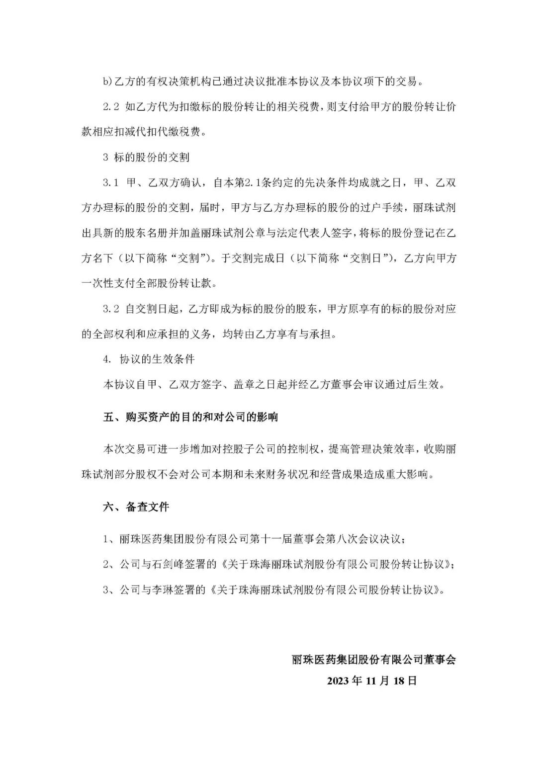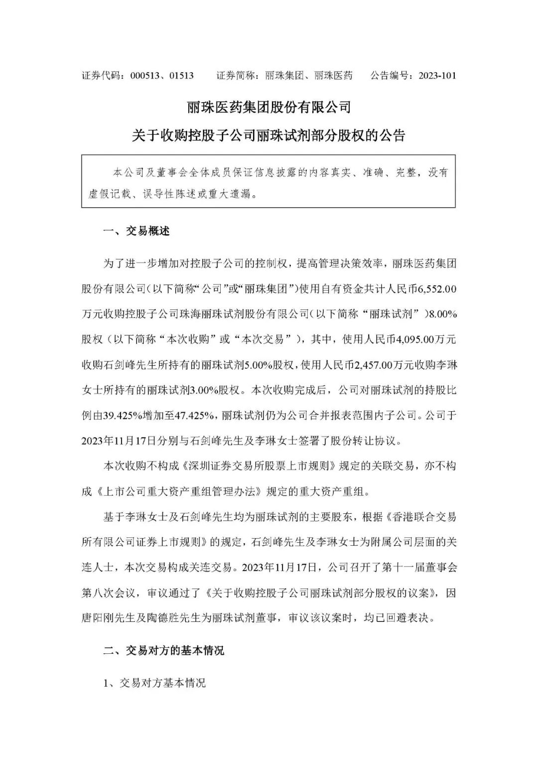丽珠医药公布,为了进一步优化控股子公司股权结构,提高管理决策效率,董事会同意公司使用自有资金共计人民币 6552万元收购控股子公司珠海丽珠试剂股份有限公司8%股权,其中,使用人民币 4095万元收购石剑峰先生所持有的丽珠试剂 5%股权,使用人民币2457万元收购李琳女士所持有的丽珠试剂3%股权。