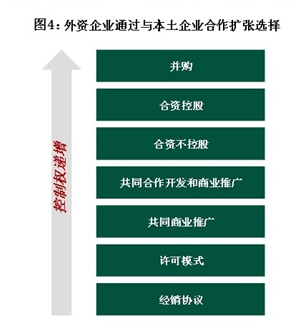 我们分析过一些半路夭折的交易谈判,导至谈判失败往往有许多原因,其中不乏“中国特色”的因素。例如在谈判过程中,企业自身的意愿摇摆不定,双方对估值的定义和方式理解不同,跨国公司内部职能部门的协调不一致等等。在外方认为双方已经就收购条款达成一致的时候,经常会出现中方的董事(通常是公司的控股股东)向外方要求提高估值的情况。最近两家CRO (医药研发外包机构) 谈判失败,正是因为中方要求增加几百万美元的研发预算,但拒绝更改研发项目的财务条款。并且中方是在双方均就合同达成一致并准备签约的时候,才提出该问题。另一个案例是,一家外资药企在和一家国内企业经过数月的谈判,正准备签订合约的时候,中方董事长突然提出要由外方向管理层支付股权变现的费用,而在之前的谈判中董事长一直承诺这笔费用由他自己承担。对于中方而言,这种做法似乎是一种合理的谈判手段,也可能是中方觉得交易过程过于顺利,担心自己利益受损的反悔行为。在外方看来,中方的这些要求是在合约基本敲定的时候提出来的,并且这些要求一般都没有明显的道理,这就会让外方怀疑未来合作伙伴的诚信问题,合作的基石——诚信已经动摇,外方便终止了与中方的并购合作。而在尽职调查的过程中,中国目标公司可能涉及历史遗留问题、劳动合同问题、环保问题,或者财务数据有出入,销售过程中有不合规行为等等,都可能拖延谈判的时间,甚至会影响到谈判的成败。即使在尽职调查之前,销售过程的不合规行为一直是跨国药企考虑收购中国药企的关键问题。在中国市场上,一些不合规的销售行为几乎是不可避免的,外资企业可以暂时接受中方个别销售代表的不合规行为,认为这些问题可以通过施加足够的监管来解决,但如果销售人员的不合规行为是由中方高管指导的,并且过于激进,外方一般会终止和该中资企业的合作。跨国药企甚至会对一些运用大包模型的中国药企进行尽职调查,因为美国反海外贿赂法(FCPA)等法规要求跨国企业对中国药企的行为承担法律责任。财务尽职调查和生产尽职调查中发现的问题,虽然不会严重到终止并购交易,但这些问题的确会影响到外方对中方的估值,导至双方难以就估值达成一致。当然,还不能忽略中国政府在交易审批过程中可能随时提出的一些新要求。 并购之外的选择 对于期望在中国市场加速扩张的外企来说,除了并购之外,还有一些其他的选择(图四),虽然对目标企业的控制力可能比起并购来说有所减弱,但是都各有利弊,符合不同的需求。在选择合作模式的时候,通常需要通盘考虑各种影响因素,包括政策许可、上市和准入时间、长期和短期战略、价值链、风险控制等等。