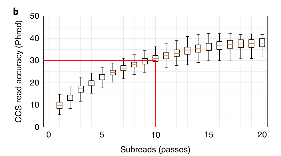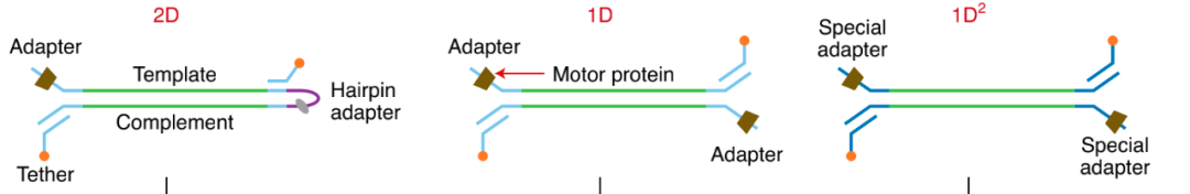 高错误率常被认为是三代测序技术的主要特征之一。不够准确的长读长测序,就像锋利而命中率不高的飞镖,破空而去,却射不中目标,不免令人失望。 然而近几年,情况似乎发生了变化。三代测序准确率有了明显的提升。它在科研界似乎从幕后走向台前,应用实例变多了,受到的关注也日渐增多。这其中发生了什么? > HiFi测序的诞生:一遍读不准,那就多读几遍咯 HiFi测序由PacBio公司开发,意思是High-Fidelity(高保真)测序。你可以认为是SMRT测序技术的进阶版。它兼具长读长和高准确率,也是目前正在推广和应用的、最具代表性的版本。 准确率之所以提升,主要是因为它采取了一种被称作Circular Consensus Sequencing (CCS)的测序模式。有人将CCS翻译为“环化共有序列”,听起来很唬人,但如果把两个词拆开来理解可就容易多了。 首先是Circular。在HiFi测序流程中,样品先被打断为一定长度的双链DNA分子(>10 kb)后,然后其两端被接上发卡结构的接头序列(Hairpin adapters)。两条链接续起来,构成哑铃形状,如下图所示。把它展开以后就是一个由DNA正链、反链和接头序列组成的环状分子。由此构建的文库叫做SMRTbell Library。 与Illumina和其他二代测序技术相似,SMRT测序过程是边合成边测序(Sequencing by synthesis),也就是说,以待测DNA为模板进行DNA复制,在合成新链的同时,通过检测新捕捉的核苷酸来确定DNA序列。HiFi测序的模板就是上述带有发卡接头的、环化了的DNA分子。由于两条链已经连接起来,DNA复制过程不存在断点,聚合酶能够在这个环状模板上跑完一遍又一遍,进行周而复始的滚环复制。这是CCS测序模式得以实现的基础。 SMRT测序技术本身的准确率不高,DNA聚合酶在环状模板上跑一次测得的序列准确率通常在90%以下。但由于测序错误的产生是随机的,这种错误可以用一个极其简单直接的方法来矫正,那就是:多跑几遍。 就好像是你有一群不聪明但很认真的孩子,你无法直接阅读一本书,而只能通过他们来间接获取关于这本书的信息。他们会向你逐字逐句地转述书的内容,但每个人都可能随机地在10-15%的字词上出错。 于是,通过比对、得到一致性序列,可以得到高准确率的测序结果。相当于让这些孩子围坐在一起讨论,所达成的共识(Consensus)部分,就可以认为是准确的。因为所有孩子在同一字词上犯错的概率极小。 如下图所示,当你有5个“孩子”,能够实现Q20(99%)以上的准确率,而当你有10个“孩子”,即在环状模板上跑10次(10 passes),准确率就能达到Q30(99.9%)。 听起来简单粗暴、量大管饱,但实现起来没那么容易。前文所说的,发卡接头将两条链接续起来后DNA连续复制是理想状况,实际上,导至DNA复制过程的中断另有其他因素,比如样品DNA本身。DNA的损伤会让聚合酶在复制中途脱落,从而使测序过程中断。因此,CCS测序模式非常依赖于样品DNA质量。需要预先筛选出高质量DNA分子,最大程度地减少受损DNA的比例,才能有效地实现高准确率测序。 另外,pass次数不可能是无限的,测序准确率的提升也是有天花板的。在环状模板上周而复始地复制,对于DNA聚合酶来说是连轴转的苦力活。它很容易就过劳死了,不可能在那个环上工作到天荒地老。 > 纳米孔测序的进阶:工欲善其事,必先利其器 与PacBio HiFi测序的“电梯直达”式的进阶之路不同,ONT提高纳米孔测序准确率的道路要显得曲折一些,更像是阶梯式的螺旋上升。 在发展纳米孔测序技术的早期阶段,ONT也曾采取与CCS相似的方法。他们也在样品DNA上连接发卡接头,只不过是其中的一端,而不是两端。这样将两条链串联起来以后,马达蛋白先牵引模板链通过纳米孔,发卡接头和另一条互补链紧随其后,从而一次完成两条链的测序,相当于对一条序列正着测又反着测,测了两次,因此ONT称之为2D模式。读取的序列则被称作2D read。对某种特定的纳米孔而言,例如ONT的R9.4纳米孔,2D模式下的测序准确率从原先1D模式下的86%提升到94%。 继2D模式后,ONT于2017年推出了1D2测序方法。他们为DNA分子的两条链分别接上一种特殊的接头,该接头大概率能使互补链和模板链被同一个纳米孔所捕获,但不能确保这一事件的发生(概率>60%)。 但由于两种测序技术在测序原理和过程上存在本质的不同,CCS策略在PacBio的SMRT测序中一路高歌的盛况,却在纳米孔测序中难以复现。纳米孔测序为边解旋边测序(不是边合成边测序),一经解旋便无法恢复,所以是一过性的,不支持反复跑、反复测。另外,核苷酸链一旦通过纳米孔,以目前的技术,应该是没法让同一条链反向再次通过同一纳米孔。所以HiFi测序中5个pass、10个pass对于Nanopore测序来说几乎不可能实现。 对纳米孔测序而言,纳米孔本身与马达蛋白的优化,可能才是属于它的康庄大道。 ONT从未停止过改进纳米孔和马达蛋白的步伐。2014年的R7纳米孔测序准确率仅为64%左右,而2016年推出的R9纳米孔一下子把准确率提升至~87%。根据ONT官网提供的数据,R10.4.1在特定的测序条件下,可以达到99.9%以上的准确率。 事实上,获取共有序列(Consensus sequence),即对同一序列的多个拷贝进行测序,或者对同一序列多次测序,是消除随机误差的常见方法。采取此方法的测序准确率也被称作Consensus accuracy。除了HiFi测序的CCS模式以外,还可以通过扩增样品DNA、提高测序深度、算法矫正等方式来提高准确率。ONT纳米孔测序的最新版本R10.4.1,其Consensus accuracy据说可以达到99.999%(10-20x