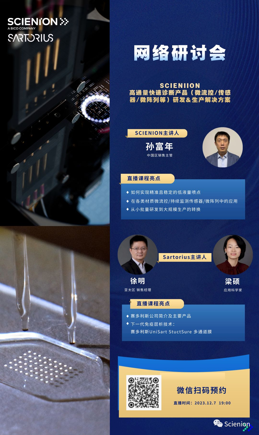 扫描上方二维码 登记信息可获精美礼品一份 新的知识,新的视角,新的启发!SCIENION与赛多利斯为您带来一场前所未有的网络研讨会。 为诊断学和其他生命科学领域实现微型化多重检测;我们在生命科学和诊断领域的客户受益于我们独特的产品组合、全面的解决方案服务,以及20年来在下一代多重反应分析方面累积的专业知识。 在本次网络研讨会中,我们将详细讨论SCIENION的最新解决方案,以及如何将这些解决方案有效地应用到研究和生产中。 本次研讨会SCIENION将为您提供: