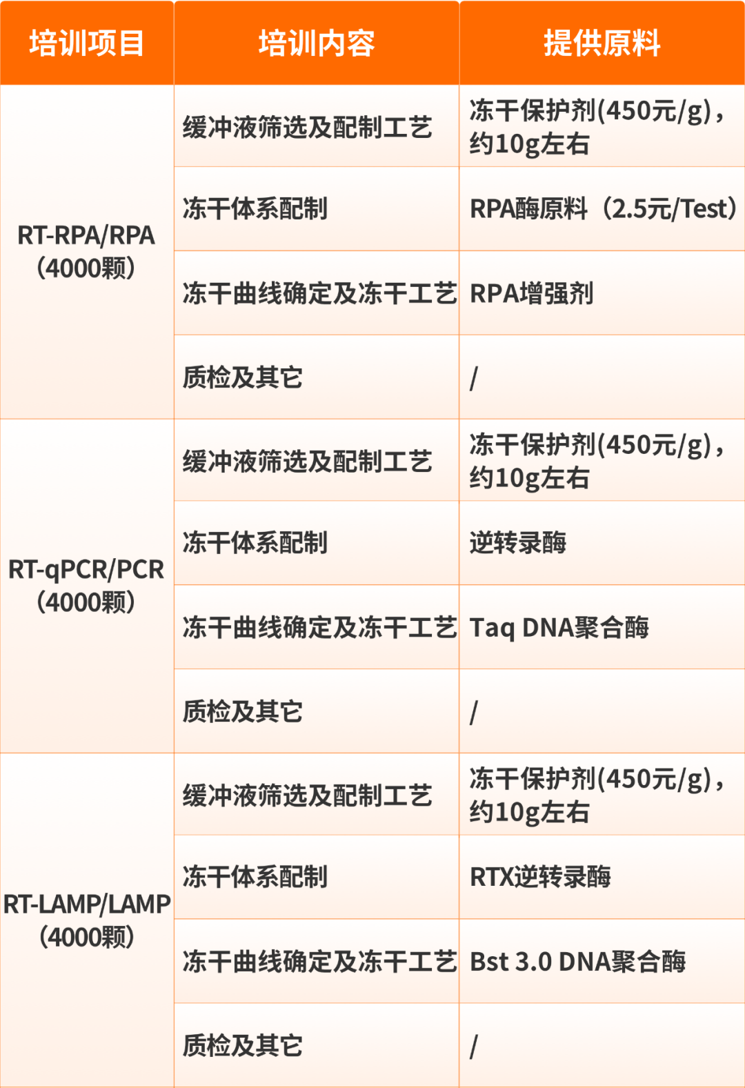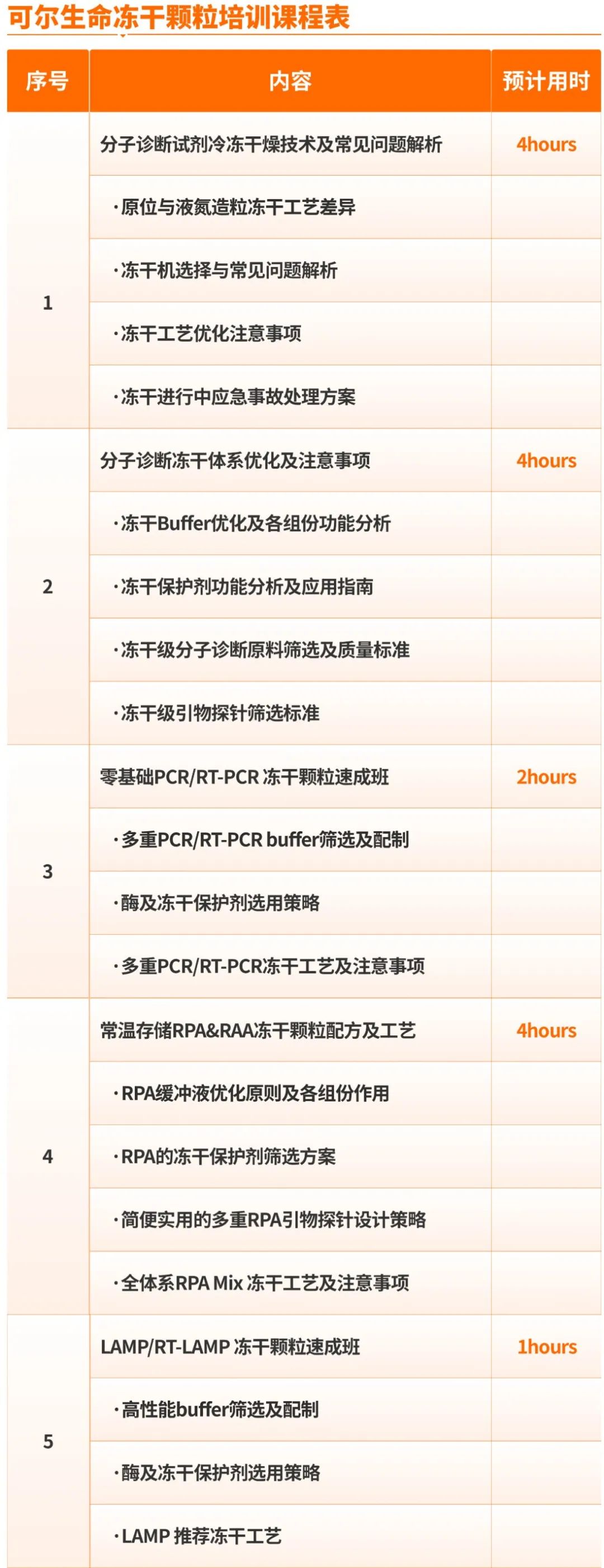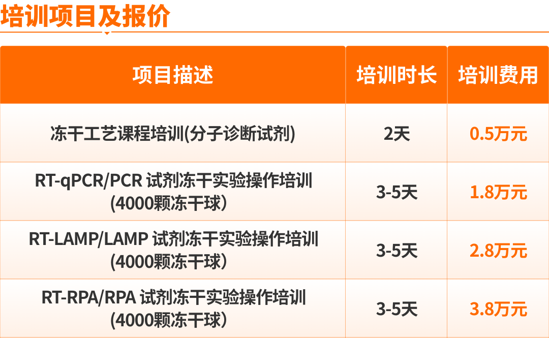 培训主题:分子诊断试剂冻干培训及实战演练 (PCR/LAMP/RPA 系列) 扫码报名 实操培训需准备: 参加实训需准备引物及探针(若无可以不准备),引物及探针需符合以下条件:酶、冻干辅料、实验耗材及实验设备均由可尔生命提供,现场冻干。