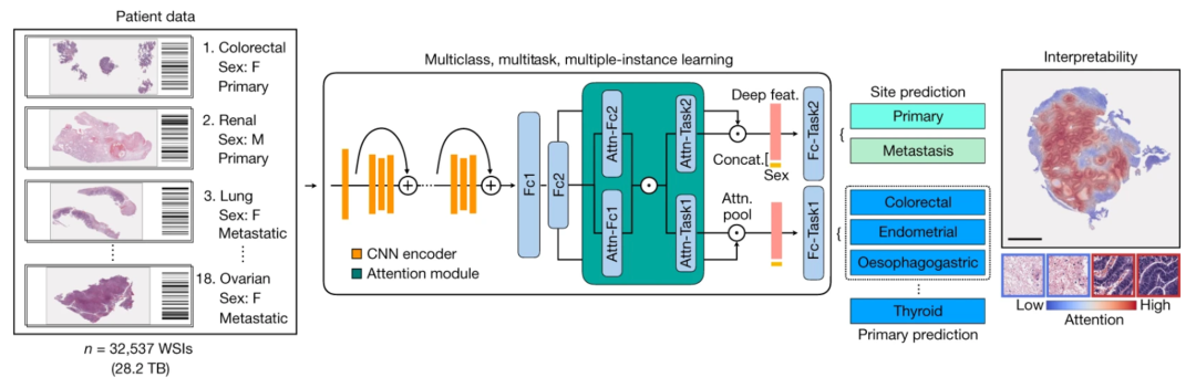 第二个新进展是解决不明癌症原发灶的问题。来自哈佛大学的研究人员通过训练一个卷积神经网络(CNN)模型,研究者仅依靠读取患者的病理切片,便能实现对原发灶不明癌症的溯源。