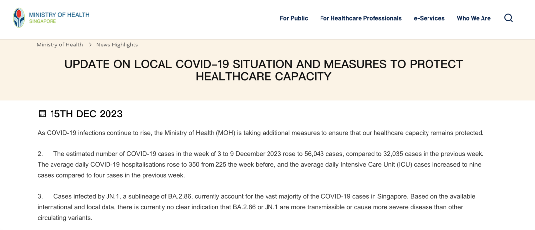 新加坡卫生部当地时间12月15日发布声明称,预计当地12月3日至9日新增56043例新冠确诊病例,比前一周的32035例增近75%。住院人数从前一周的每日平均225人增至350人,加护病房的患者则从日均4人增至9人。 图片来源:新加坡卫生部官网 新加坡卫生部表示,根据现有国际和本地数据,至今没有明确迹象表明目前多数病患所感染的BA.2.86或JN.1比其他流行变种传染力更强,或症状更严重。 尽管如此,新加坡卫生部强烈建议公众,即使没有身体不适,也要在室内、拥挤场所或与高危群体互动时佩戴口罩,与此同时应接种新冠疫苗加强针以增强免疫力。 什么是JN.1变异株?我国情况如何?近日,国家疾控局发布关于新冠病毒JN.1变异株相关问答。 国家疾控局:不排除JN.1变异株 成为国内优势流行株的可能 一、什么是JN.1变异株? JN.1是新冠病毒奥密克戎BA.2.86变异株的第二代亚分支,也是BA.2.86变异株中具有较强传播优势的一个亚分支。该变异株于今年8月25日在卢森堡采集的样本中首次监测到。11月以来,由于JN.1在全球流行毒株中的占比增长较快,世界卫生组织于11月21日,将BA.2.86变异株从“需要监测的变异株”(VUM)升级为“需要关注的变异株”(VOI)。 二、国际上JN.1变异株的流行情况如何? 今年11月以来,JN.1变异株在全球流行毒株中的占比迅速增加,从11月初的约4%增长至12月初的30%左右。截至12月10日,全球至少有40个国家/地区监测到JN.1变异株。从分布看,欧洲占比最高,美洲等大洲的JN.1变异株所占比例亦呈快速增长趋势。 三、我国开始流行JN.1变异株了吗? 我国现阶段的主要流行株仍为EG.5及其亚分支。自11月首次发现本土JN.1变异株以来,截至12月10日,在我国本土病例中共监测到7例JN.1变异株。虽然当前JN.1变异株在我国流行水平极低,但后续受国际流行株和输入病例影响,不排除JN.1变异株成为国内优势流行株的可能。 四、JN.1变异株传播得更快了吗? 从各国流行情况看,近期JN.1变异株在多个国家增长迅速,但研究显示,在传播方面JN.1与XBB变异株差异不明显。世界卫生组织报告显示,含有XBB.1.5成份的新冠病毒疫苗仍对JN.1变异株有效。因此,在人群对奥密克戎变异株广泛免疫(包括疫苗接种和自然感染)的前提下,JN.1变异株的传播能力可能相对有限。 五、感染JN.1变异株后,症状会更严重吗? 世界卫生组织评价包括JN.1在内的BA.2.86变异株临床重症感染风险为低等。美国监测数据显示,JN.1变异株近期在美国新冠病毒感染病例中占比增加,并没有发现因感染JN.1变异株后引起疾病严重程度增加的情况。我国监测数据显示,JN.1变异株感染者均为轻型或无症状。不同变异株引起的症状往往相似,症状的类型和严重程度通常更多地取决于个体免疫力。基于现有证据,JN.1变异株的公共卫生风险较低。 六、如何防控JN.1变异株? 与预防其他奥密克戎变异株感染一样,建议公众继续保持良好个人卫生习惯,科学佩戴口罩,及时接种疫苗,坚持规律作息,保证健康饮食,提高机体免疫力。 专家:无须担忧JN.1 据澎湃新闻,12月12日,复旦大学生命科学学院青年研究员、从事新发传染病防治方面研究的王鹏飞表示,考虑到上一波感染后抗体水平下降的情况,加上JN.1具有较强的免疫逃逸力,可能会在2024年1-3月在国内传播,引发新一轮的感染高峰。但是由于当前人群感染背景复杂,难以判断新一轮的传播强度。 同日,香港大学李嘉诚医学院教授、微生物学家金冬雁则表示,公众无须担忧JN.1,它在全球范围内都不可能造成重大疫情。金冬雁强调:“新冠病毒会和人类长期共存,肯定会出现传播性强一点的变异株,但是传播性强也没有关系,致病性没有增强。” 来源:中国日报网 新加坡卫生部官网 国家疾病预防控制局微信公众号 南方日报 |