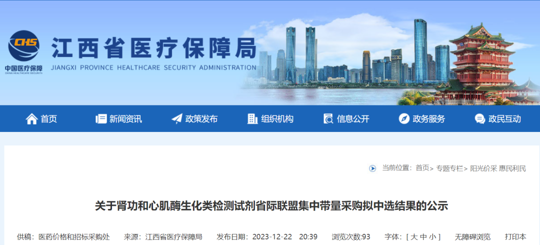 12月22日,江西医保局招采处发布通知,关于肾功和心肌酶生化类检测试剂省际联盟集中带量采购拟中选结果的公示。2023年12月22日至2023年12月28日。如有异议,请于公示期内提出申诉,并提供合法有效证据材料,逾期原则上不予受理。