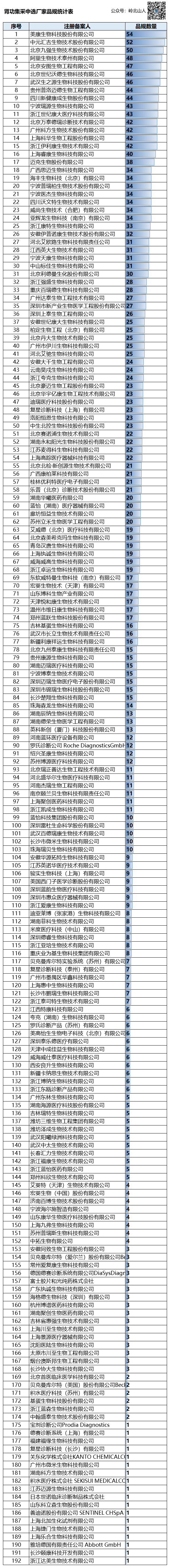 从品规数量来看,此次带量采购,一共有28个产品,按中选品规数量来看:美康生物排名第一,共入选54个品规;中元汇吉排名第二,共入选52个品规;九强生物排名第三,共入选50个品规。