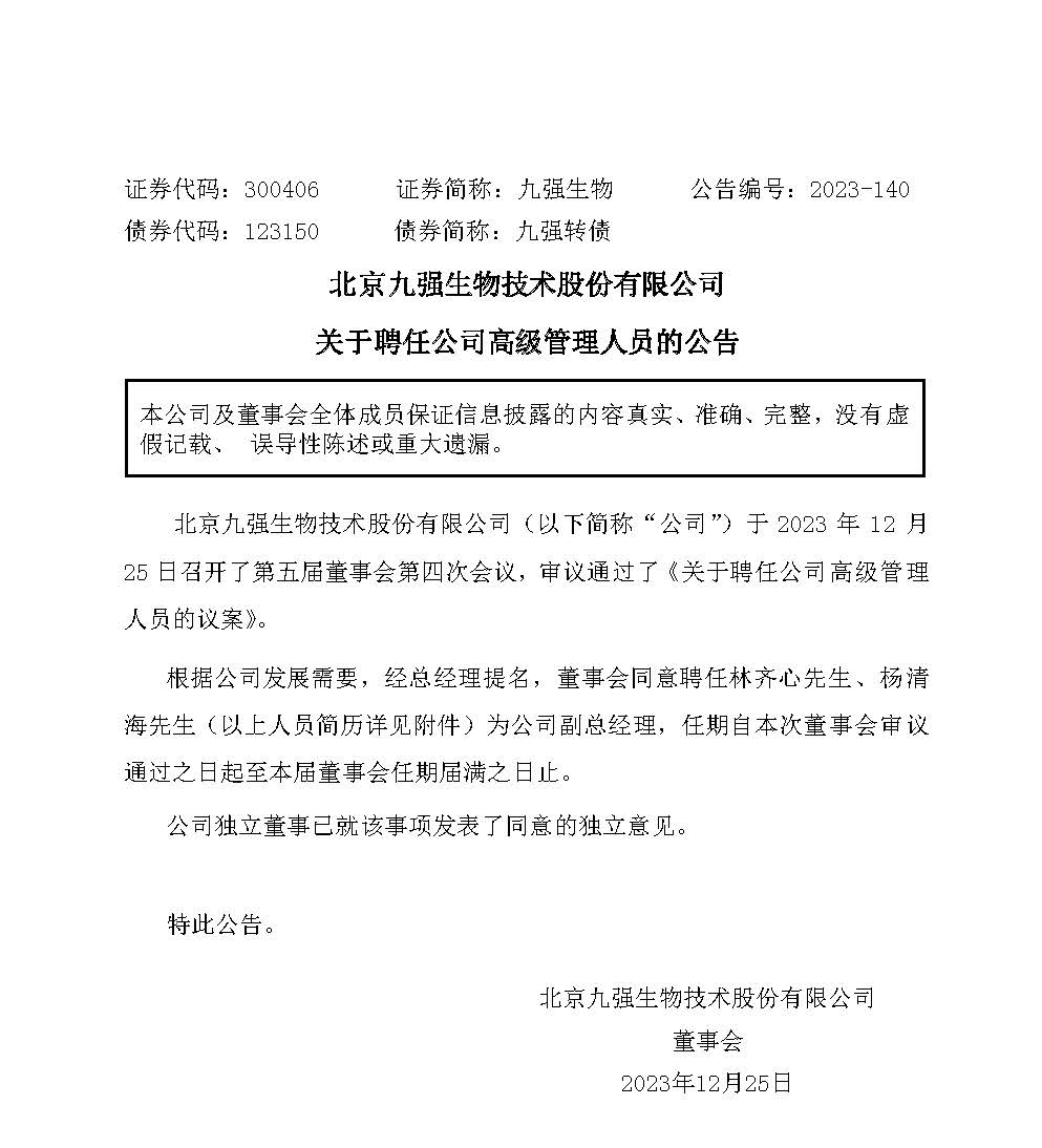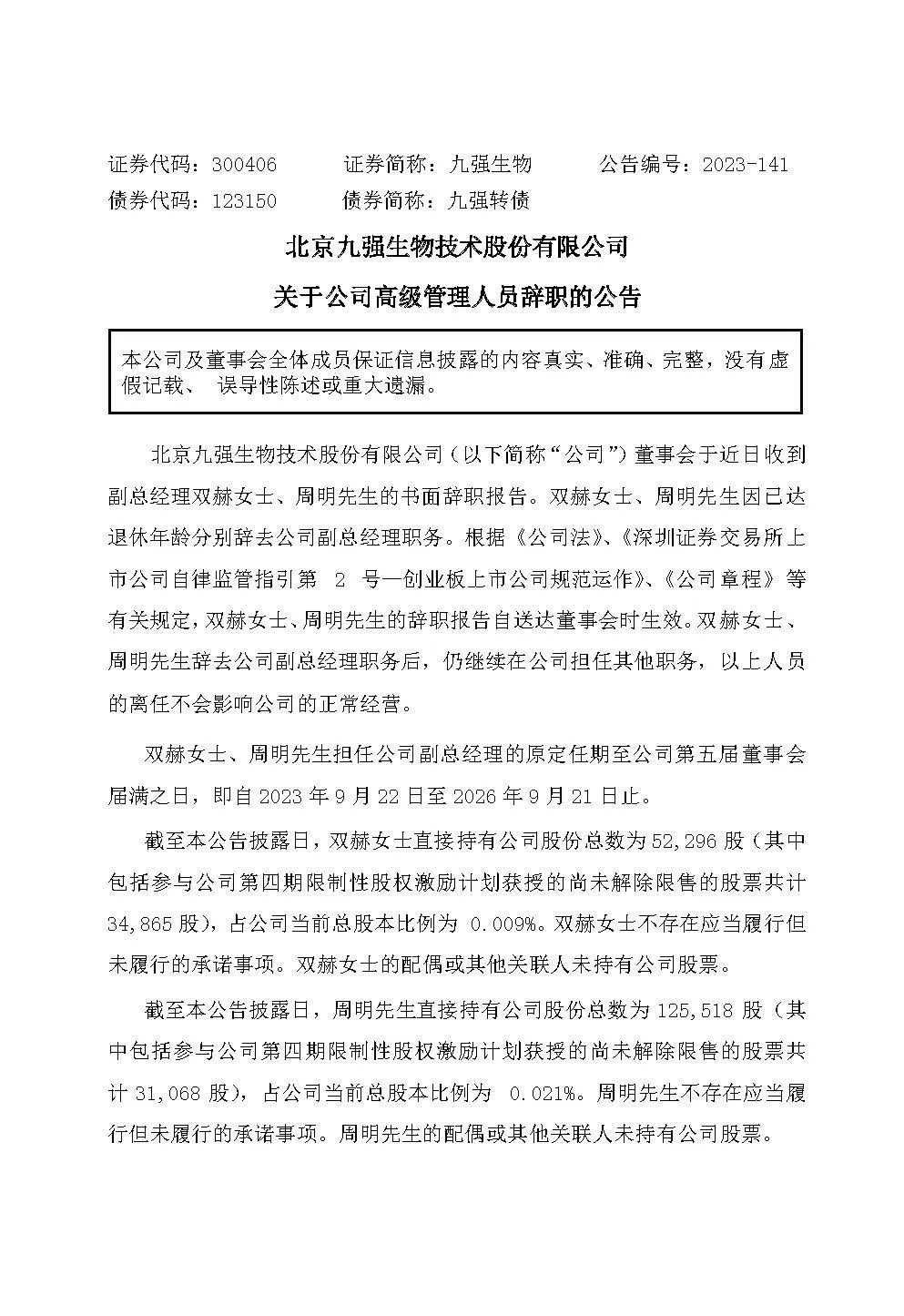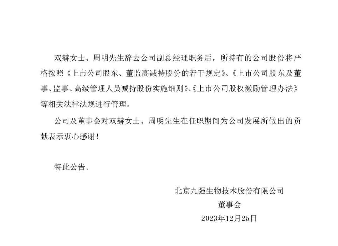 12月25日,九强生物公告,董事会于近日收到副总经理双赫女士、周明先生的书面辞职报告。双赫女士、周明先生因已达退休年龄分别辞去公司副总经理职务。双赫女士、 周明先生辞去公司副总经理职务后,仍继续在公司担任其他职务,以上人员的离任不会影响公司的正常经营。双赫女士、周明先生担任公司副总经理的原定任期至公司第五届董事会届满之日,即自2023 年 9 月 22 日至 2026 年 9 月 21 日止。