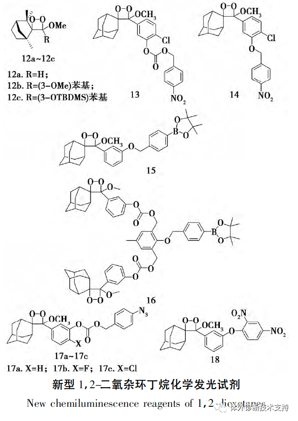 新型1,2-二氧杂环丁烷类化学发光试剂由于1,2-二氧杂环丁烷的化学发光非常高效,近年来,各种新型的二氧杂环丁烷发光试剂成为研究的焦点。1,2-二氧杂环丁烷一般含有金刚烷酮基团,而Ciscato 合成了含葑基的1,2-二氧杂环丁烷(12) ,研究发现含葑基的1,2-二氧杂环丁烷同含金刚烷酮的1,2-二氧杂环丁烷化学发光性质相似。