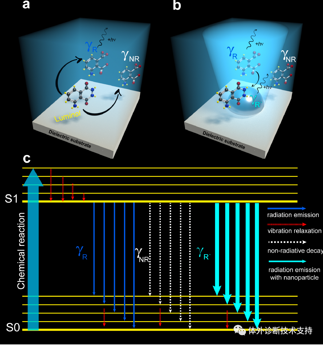 ③激发态中间体通过光的形式释放多余的能量回到基态。激发态回到基态的方式很多, 如磷光,放热等, 所以激发态中间体的荧光效率φf 也需要比较高。整个过程的化学发光效率φcL =φc ×φe ×φf 。