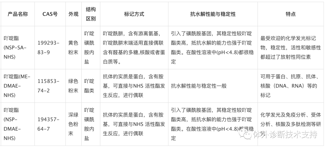 吖啶酯量子产率高;发光效率高,作为化学发光标记物发光体系简单,自然本底低,受干扰少,信噪比较高;用作化学发光标记物时,除具有上述优点外还易于偶联、标记简单且稳定性好、标记后对其发光性能影响少,是目前临床上应用最广泛的一种化学发光试剂。