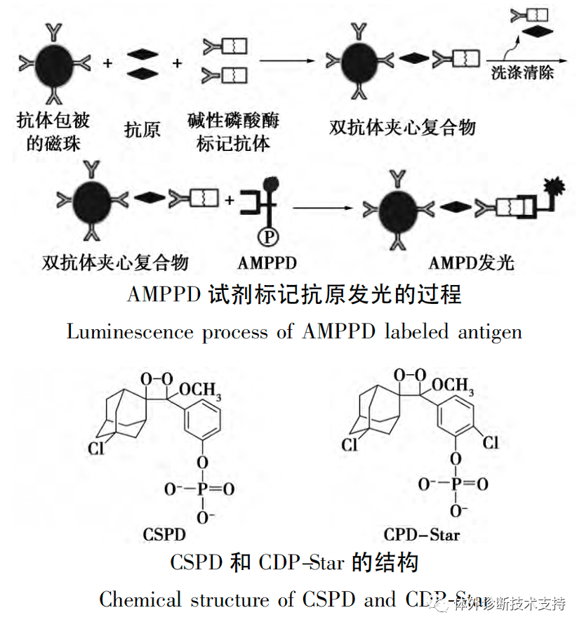 它们分别有相对应的发光底物,HRP 发光底物常选择鲁米诺而AP 则选用AMPPD。CLEIA 的优点为:灵敏度高,酶标记抗原或抗体结合稳定,发光持续时间长,便于记录和测定;缺点在于反应速度慢,表面积低、酶容纳量小。