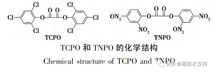 过氧草酸酯类化学发光体系由草酸酯、氧化剂( 过氧化氢) 和荧光剂组成,是一种间接化学发光体系。常见的发光试剂有双[2,4,6-三氯苯基]草酸酯( TCPO) 、双[2,4-二硝基苯基]草酸酯( TNPO) 等。发光机理为反应生成的中间产物将化学能传递给荧光团使之激发到激发态,激发态的荧光团跃迁到基态过程中发射出一定波长的光。