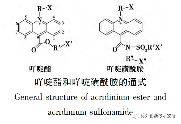 吖啶酯是一类重要的化学发光试剂,具有较高的量子产率,其化学发光效率较高,通常是鲁米诺的五倍或五倍以上。除此之外,吖啶酯的化学发光过程反应迅速,本底低,在氢氧化钠和过氧化氢的存在下即可发光。在氧化反应过程中,结合物被分解,不影响游离吖啶酯的发光;另外,吖啶酯类化学发光试剂具有较好的稳定性,易于储存。