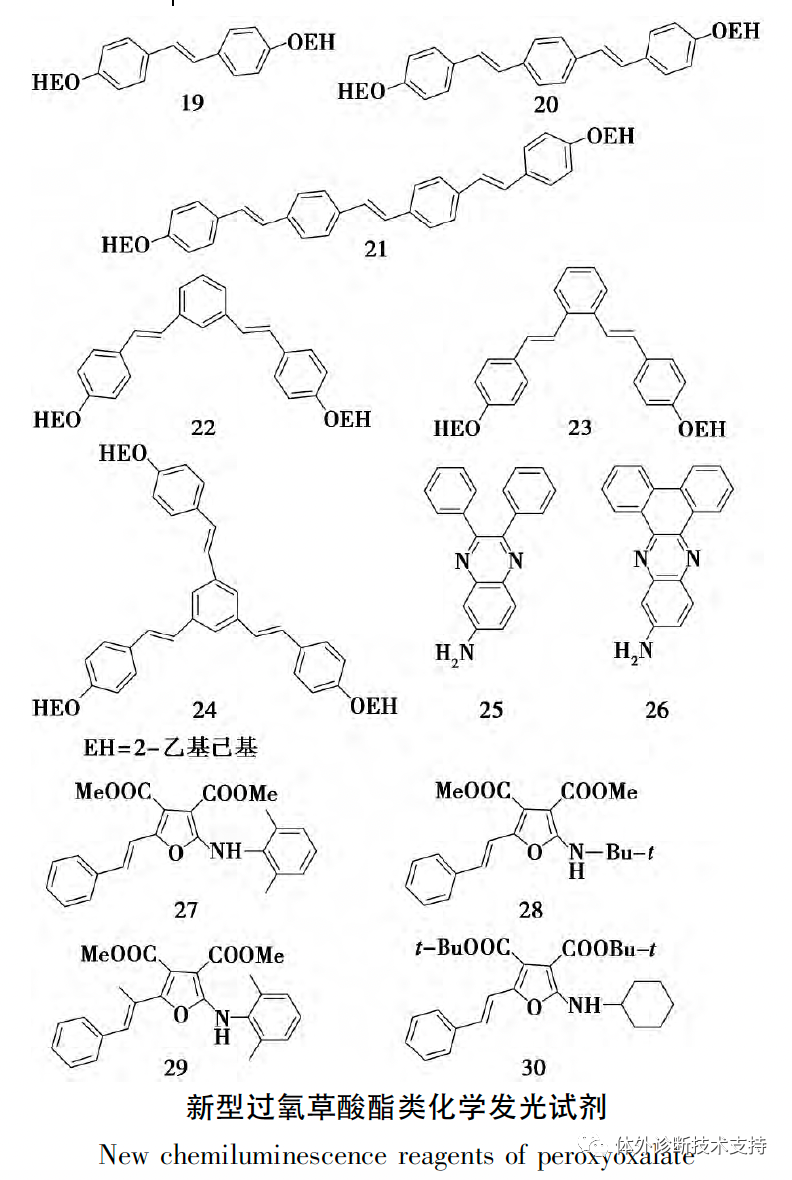 过氧草酸酯类常见的发光体系由TCPO、过氧化氢和不同的荧光剂组成。近几年,发现合成不同的新型荧光团( 对苯乙烯、苯并吡嗪衍生物、呋喃衍生物等) ,与TCPO 和过氧化氢组成发光体系成为发展趋势,并且广泛应用于不同领域,而新型的过氧草酸酯化合物研究比较少。