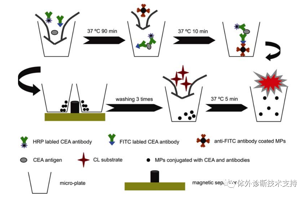 但是,该方法的灵敏度比酶促反应稍低,且发光的持续时间较短。因此,检测过程中对小分子抗原的检测多采用竞争方法,而对大分子抗原的检测多采用夹心法,目前在免疫测定中得到了广泛的应用。